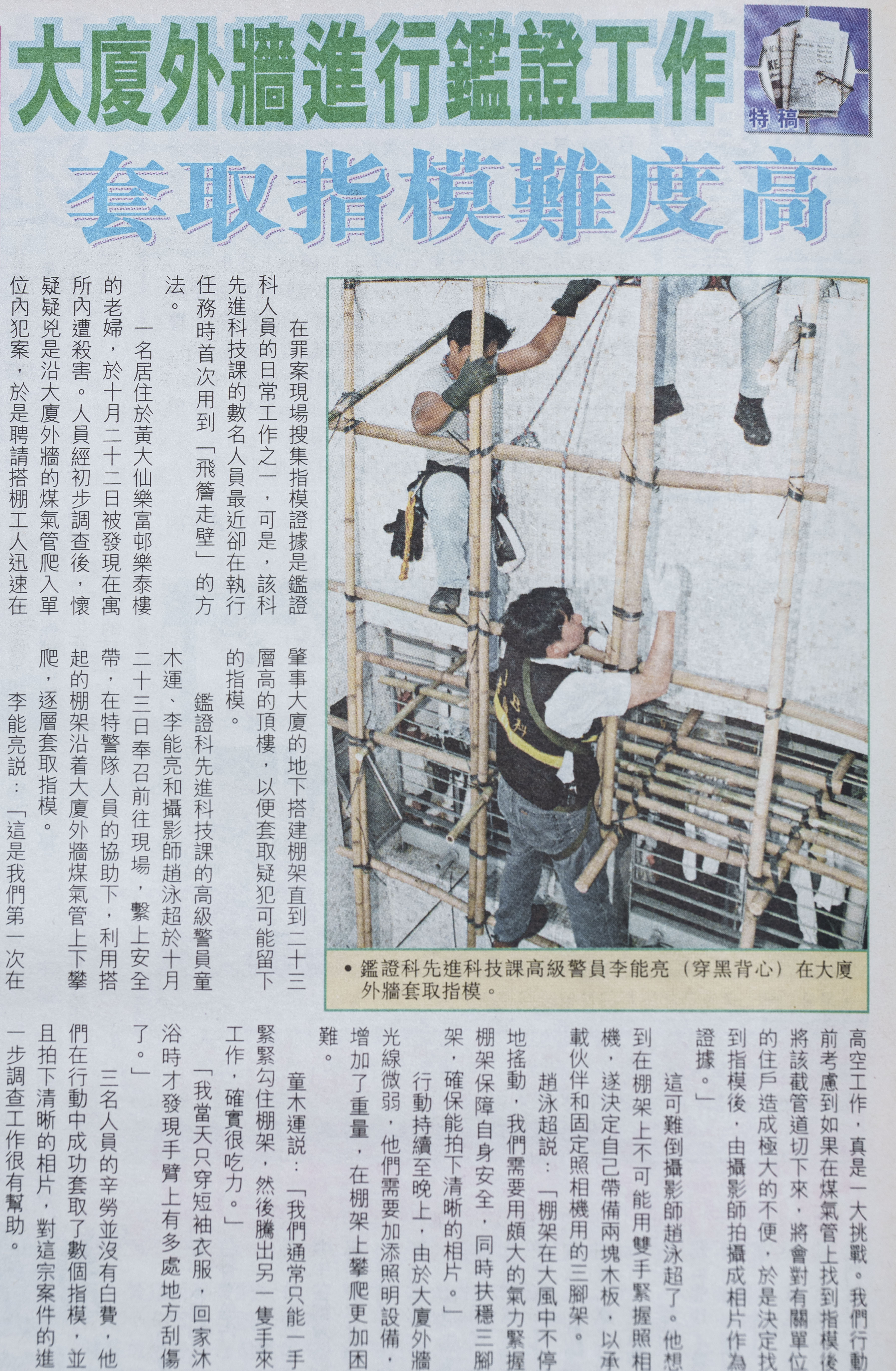 報道中,一名鑑證科人員說:「既要勾緊棚架、又要騰出手來工作,確實吃力!」原來,他正是童俊凌的父親童木運。看着報道與父親的相片,童俊凌即憶起當年有日父親回家,手臂被颳得傷痕纍纍,令他深深感受到其專業精神。 鑑證科的主要工作,是在罪案現場套取指模和DNA,經常要接觸屍體。童俊凌分享:「有時屍體腐爛,現場會出現大量蛆蟲和蒼蠅,就算戴上保護衣和口罩,蒼蠅還是有機會鑽進來。但無論環境有多惡劣,亦絕不會影響到我們的搜證工作。」