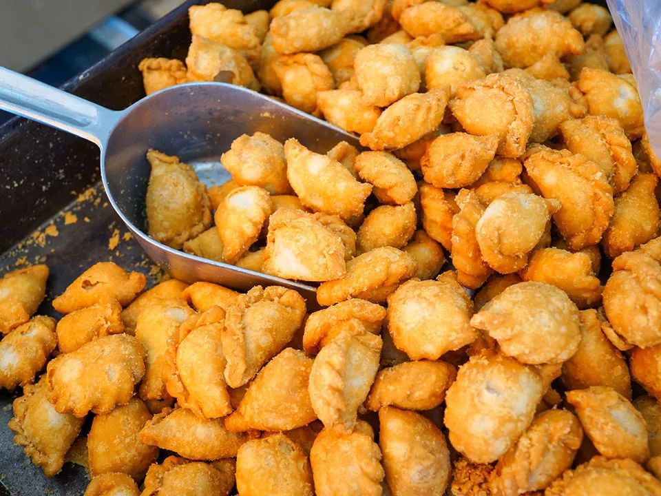 油角看起來雖然有點像餃子,但它是廣東一帶過年獨有的小吃。它以糯米為外皮,鹹的包滿豬肉或冬菇,甜的則以花生或椰子等為餡料。油炸後會變得非常飽滿,像古代的元寶。新年吃一顆油角,寓意新一年賺得盆滿缽滿。