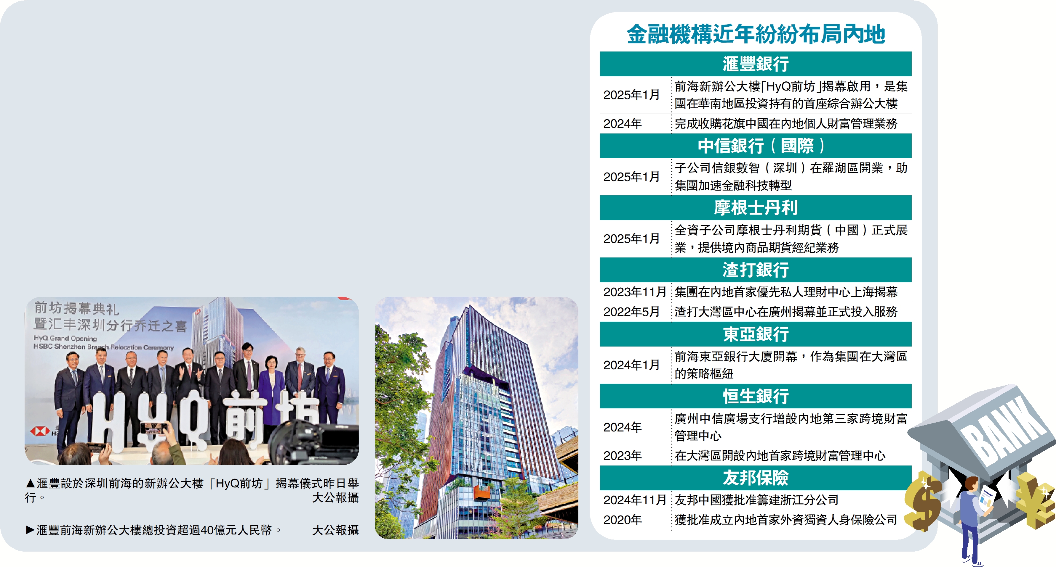 除了滙豐前海新大樓揭幕啟用,滙豐中國在深圳首家新一代財富管理旗艦網點昨日也正式開業。另外,中信銀行(國際)旗下子公司信銀數智(深圳)信息技術公司,昨日亦於深圳羅湖開業,有助銀行加速金融科技轉型。
