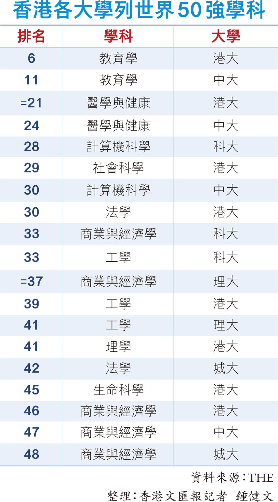 (香港文匯報 記者 鍾健文)香港正積極推進成為國際專上教育樞紐,當中實力保證之一就是擁有世界一流的學科水平,而本港多所大學在新一年開始不久傳來佳音。國際高等教育研究機構泰晤士高等教育(THE)昨日公布世界大學學科排名2025,香港共有5所大學共38個學科位列世界百強,當中19個學科更躋身世界前50名。排名最高的是香港大學的教育學高踞世界第六;香港中文大學教育學亦排名世界第十一,呈向世界十強「叩關」之勢。而在醫學與健康學科,港大及中大雙雙躋身世界25強,分列第二十一位及第二十四位。