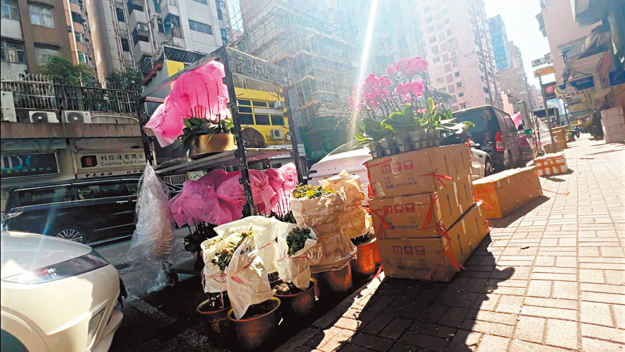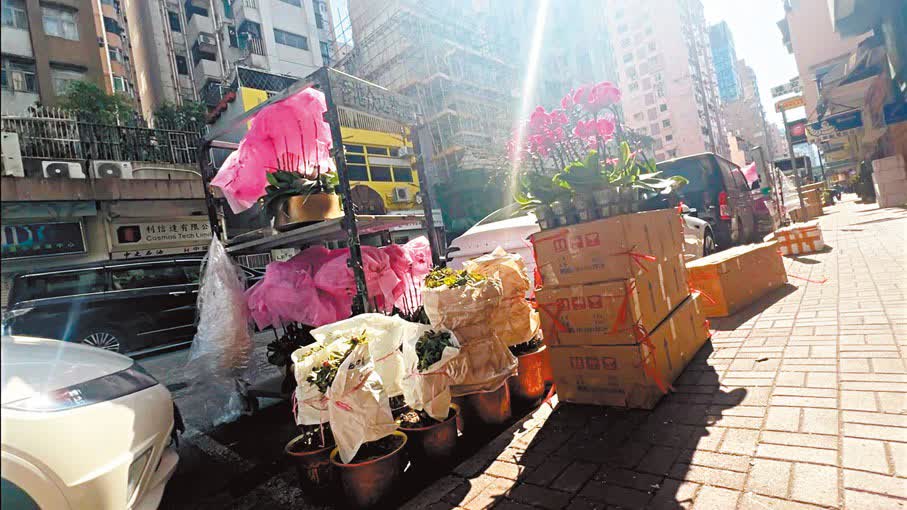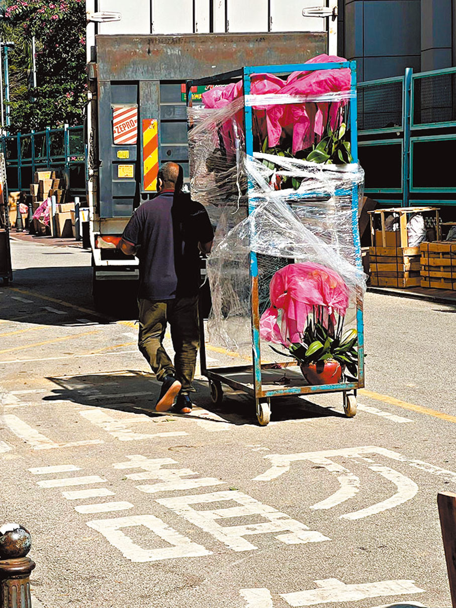 記者選定貨品及網上付款後,按照和賣家約定的日子及時間,來到旺角花墟一間物流公司取貨,該公司道路兩旁都被大大小小的花卉佔據。這天上午9時許,街道上就泊滿正在落貨的貨車,卸下的貨物已霸佔街道兩旁的行人路,其中大部分為蝴蝶蘭和年桔,亦有小量桃花、水仙等擺在路旁,直到中午12時許,街道上差不多九成的貨物由貨主取走。