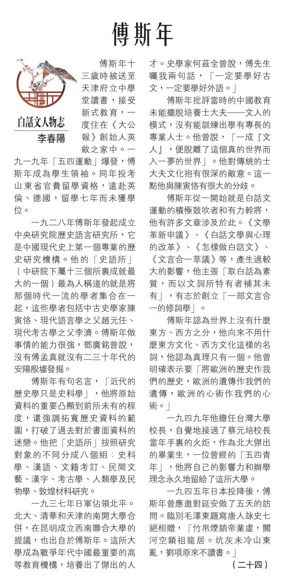 傅斯年十三歲時被送至天津府立中學堂讀書,接受新式教育,一度住在《大公報》創始人英斂之家中。一九一九年「五四運動」爆發,傅斯年成為學生領袖。同年投考山東省官費留學資格,遠赴英倫、德國,留學七年而未獲學位。