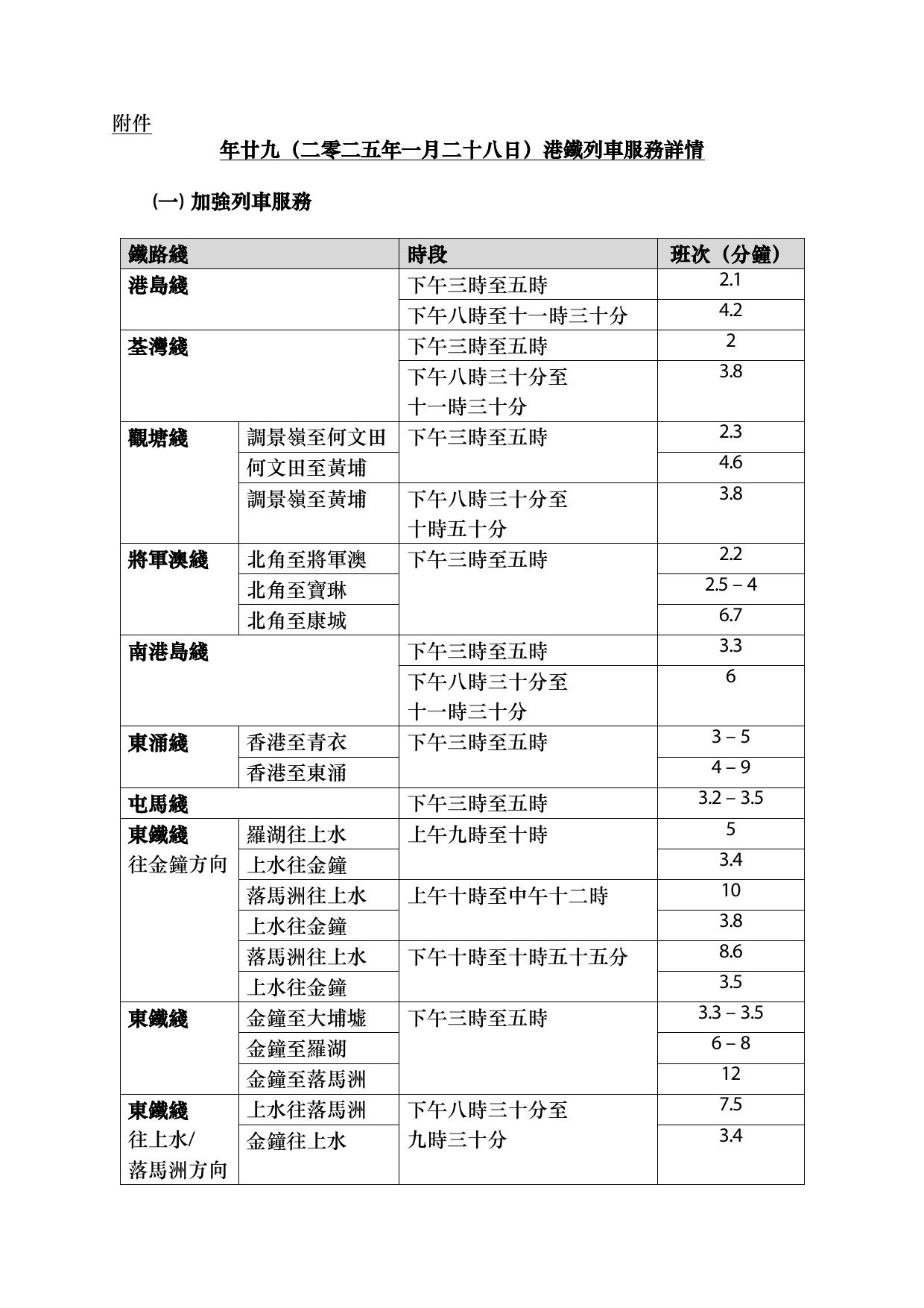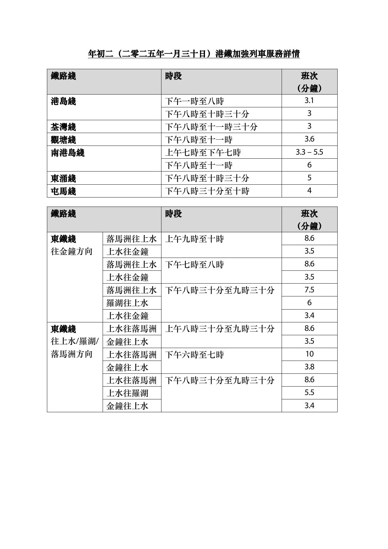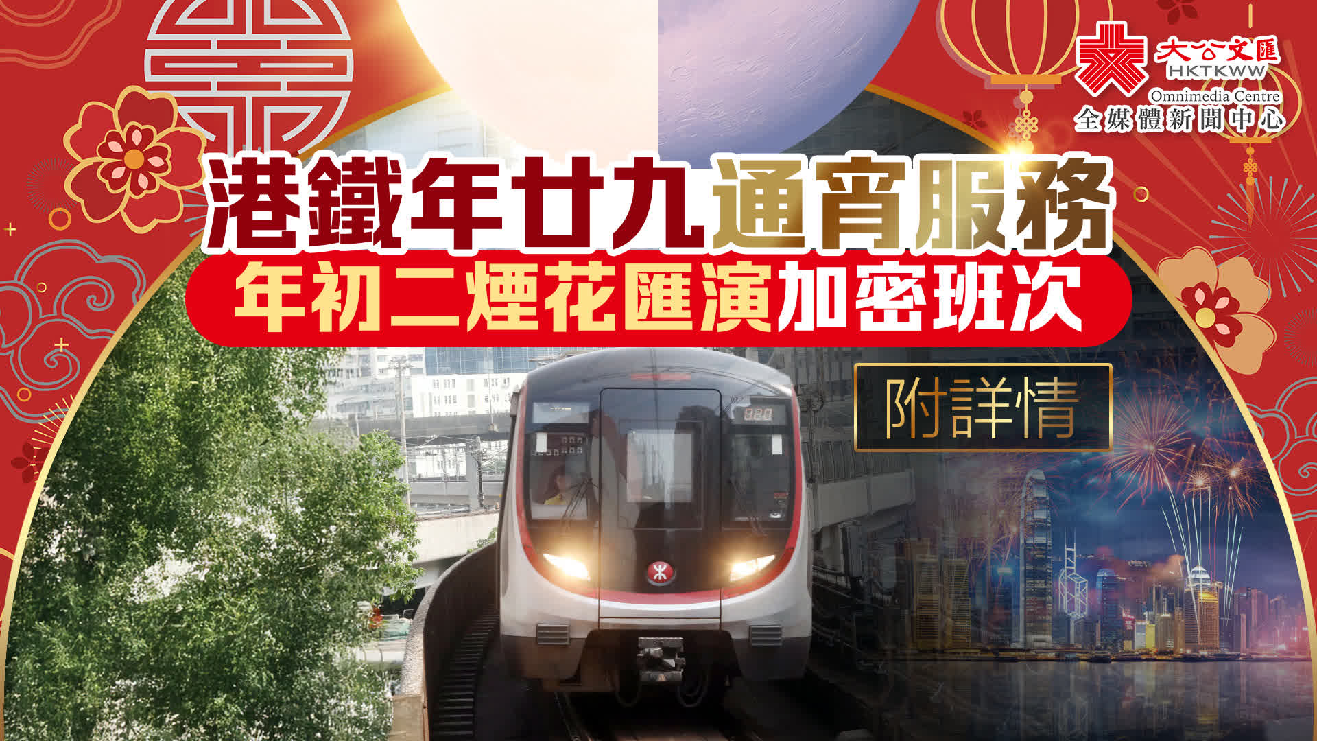 此外,年初二(1月30日)維港煙花匯演,7條鐵路綫(觀塘綫、荃灣綫、港島綫、南港島綫、屯馬綫、東鐵綫及東涌綫)將調整班次,以配合乘客前往觀賞及離場,而東鐵綫更會於當天早上開始逐步加強服務。