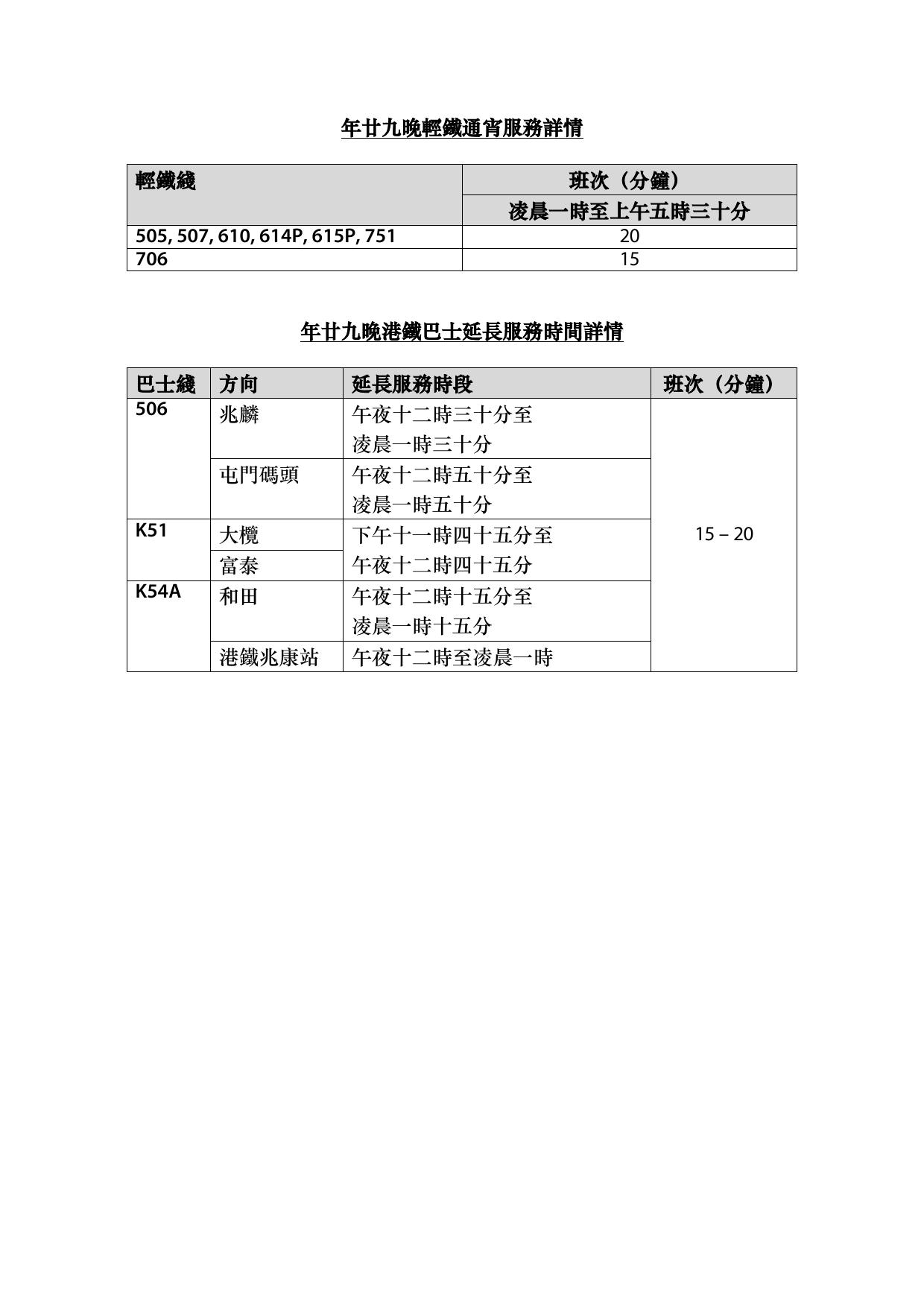 至於在年廿九(1月28日),8條本地鐵路綫將提早於下午3時行駛晚上繁忙時段班次,港島綫、荃灣綫、觀塘綫及將軍澳綫(北角至將軍澳站)將加密至約2分鐘1班車。當晚所有本地鐵路綫(不包括東鐵綫來往上水至羅湖及落馬洲站車程、機場快綫及迪士尼綫)及輕鐵7條路綫亦將通宵行駛,港鐵巴士3條路綫則會延長服務時間。高速鐵路(香港段)將如常服務。