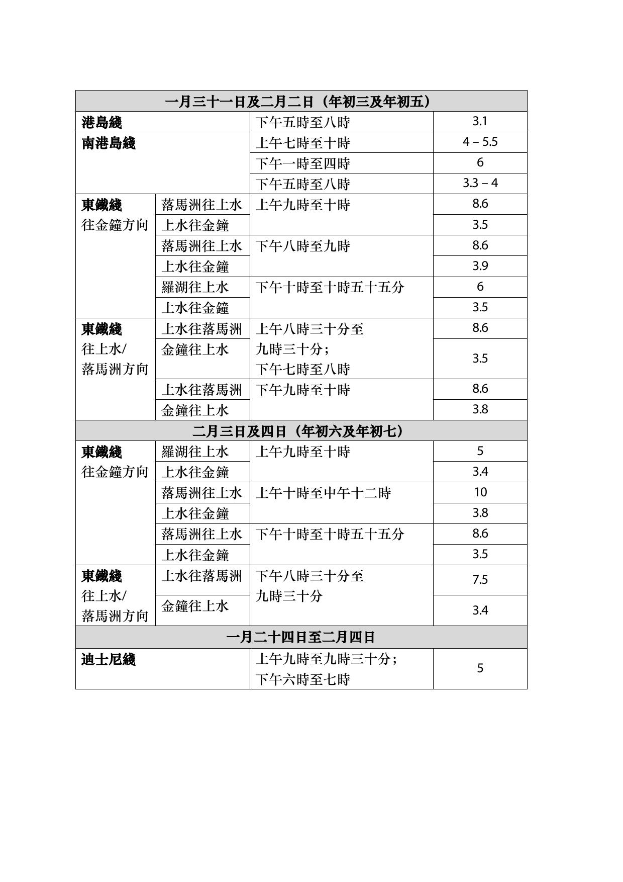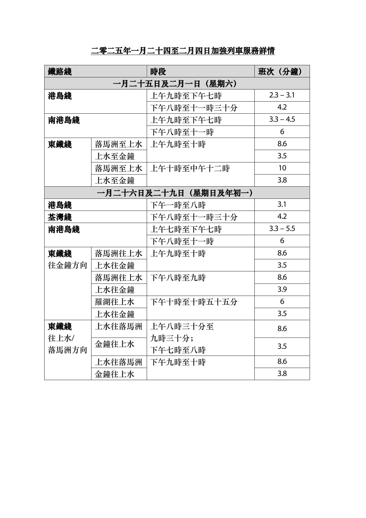 由本周五至年初七(1月24日至2月4日)期間,港島綫、荃灣綫、東鐵綫及南港島綫4條鐵路綫,會於周六、日及公眾假期指定時段加密班次,而東鐵綫及迪士尼綫亦將於此期間的大部分日子加強列車服務。