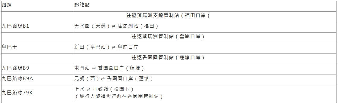 此外,九巴及龍運預計農曆新年期間將有大批市民及遊客經各邊境管制站外遊或到香港各處遊覽,將按客量情況,適時加強下列數條邊境口岸及相關接駁路線(點擊查詢詳情)。
