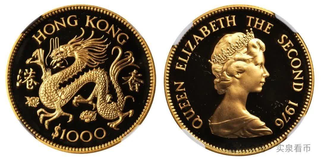 1976年農曆新年前夕,港英政府發行首枚生肖金幣——1976龍年生肖紀念金幣。金幣面值和規格同英女王訪港保持一致,也分為精製幣和普制幣。精製幣發行量為10000枚,售價1500元港幣,普制幣為20000枚,售價1000元港幣。1976龍年紀念金幣仍為香港法定貨幣,可按面值等值流通。
