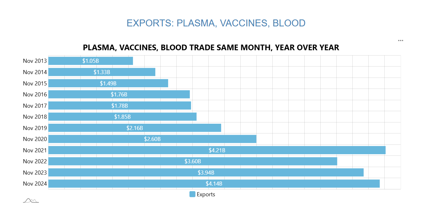 據英國廣播公司(BBC)引述US Trade Numbers網站統計數據報道,美國是世界上最大的血漿出口國。根據該網站的統計資料,單單是去年11月,美國就出口了價值41.4億美元的血漿及血液製品,預測一年能帶來400億美元的收入。