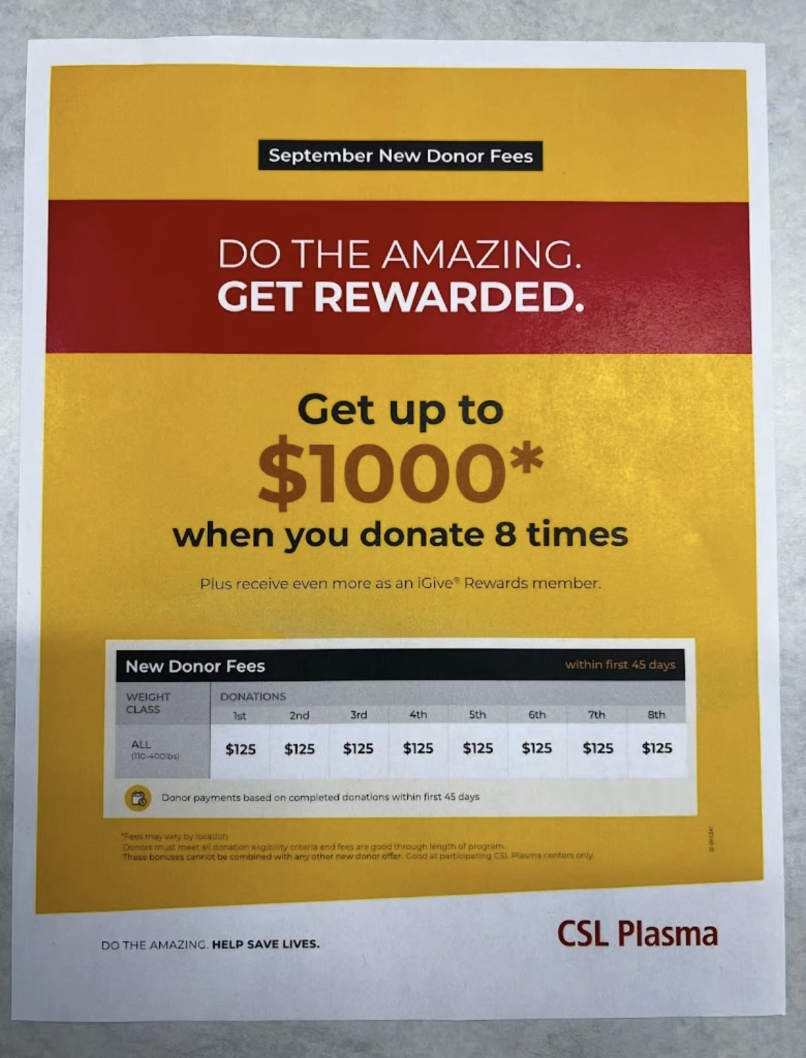 根據該美國網友的介紹,「捐獻」5次血漿可以獲得400美元的酬勞,時限是30天;「捐獻」8次血漿可以獲得1000美元的酬勞,時限是45天;第一次「捐獻」有額外的50美元獎勵,而介紹朋友「捐獻」還能獲得推薦費。至於「捐獻」多少血漿,在不同的州有不同的情況,有的州甚至沒有限制。該網友還提到,「需要預約排隊,因為人很多。」