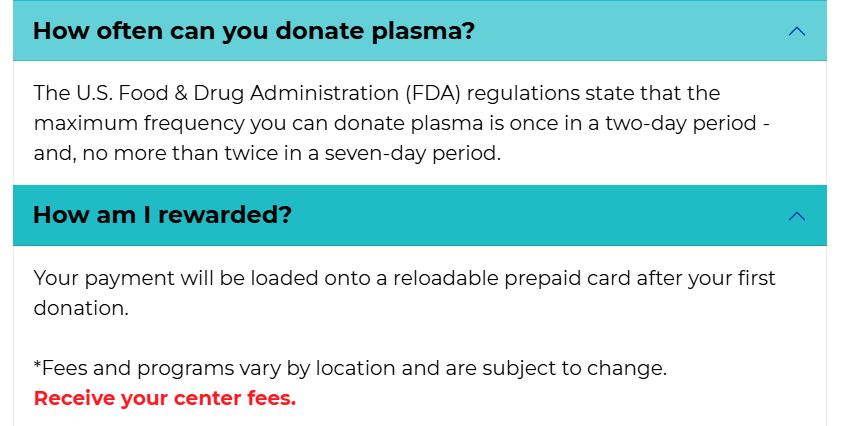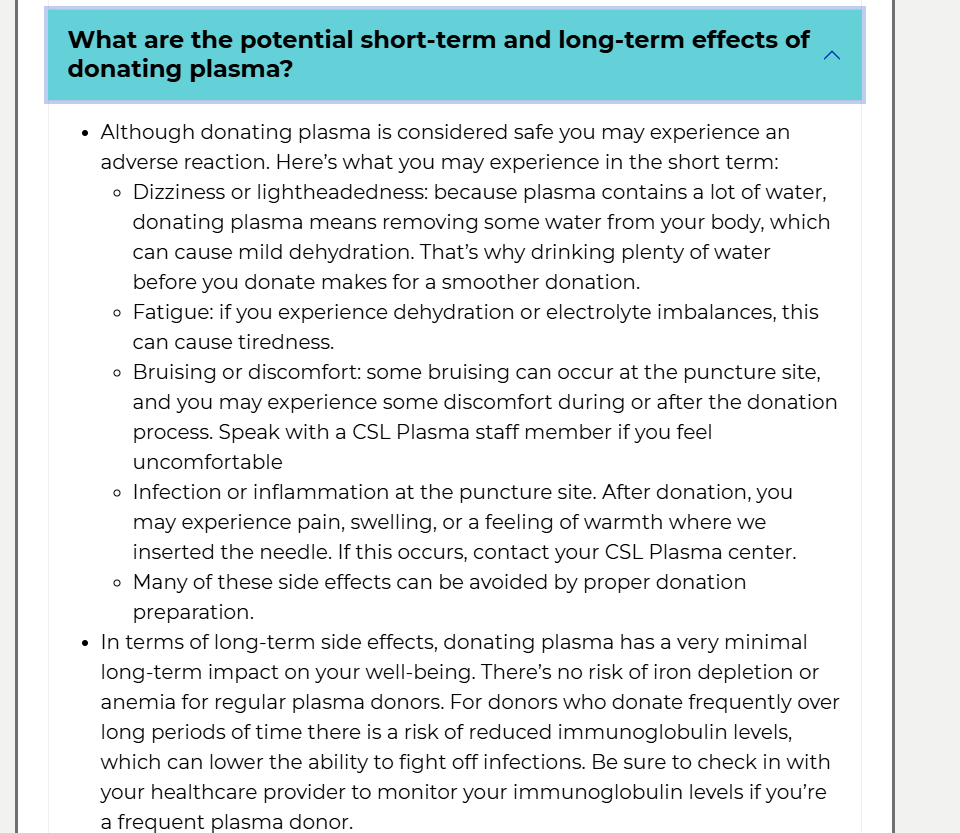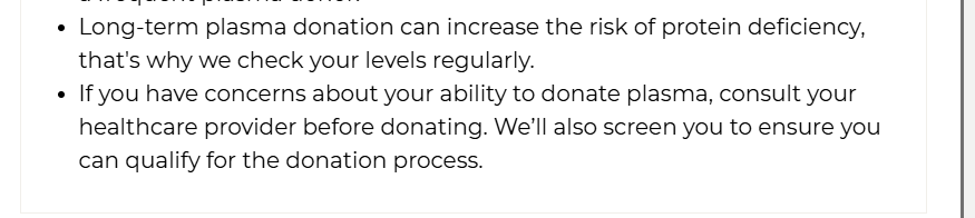 在該抽血中心的官網上,「多久可以捐獻一次血漿」的問題答案寫道:「美國食品藥品監督管理局建議,血漿捐獻的最多為兩天一個周期、一周不超過2次。」在「『捐獻』血漿的影響」的問題中,該公司說:「長期『捐獻』血漿幾乎沒有副作用,對你的健康影響非常小。」只在最後幾段提到,「如果您是經常『捐獻』血漿的人,請務必進行醫療諮詢以監測您的蛋白質水平……長期『捐獻』血漿的人會增加蛋白質缺乏的風險(increase the risk of protein deficiency)。」