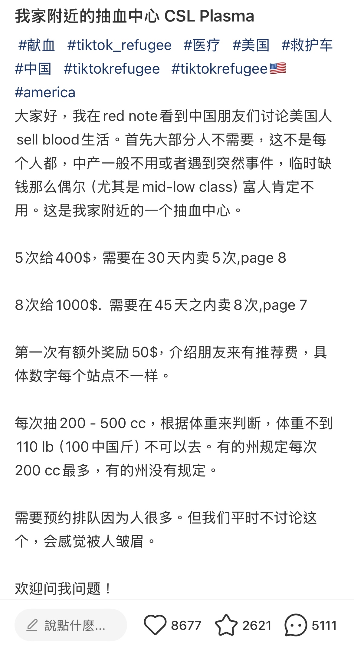 該名美國網友在帖文中寫道「只是一個典型的美國人『捐獻』血漿以獲得額外的錢來支付賬單。中國有血漿捐獻中心嗎?」短短幾行字讓中國網友震驚無數次:「捐獻」血漿?獲得額外的錢?支付賬單?這不就是賣血嗎?!