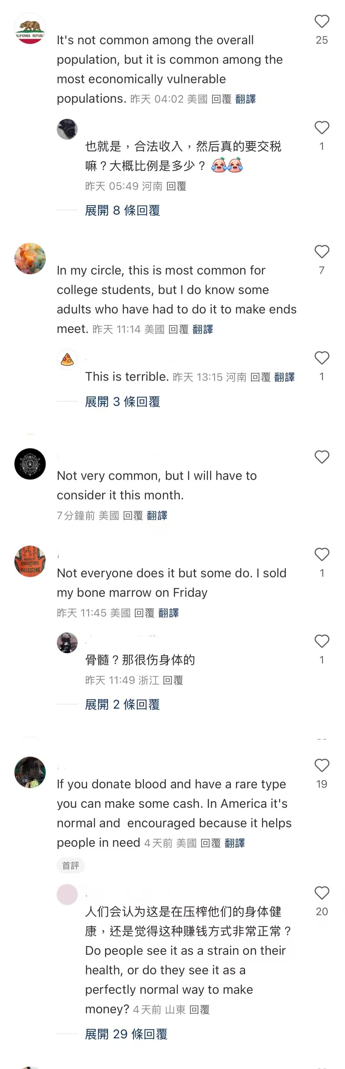 在該則血漿「捐獻」的帖文引發熱烈討論後,有不少中國網友詢問美國網友這是否真實,得到的都是肯定的答案。有美國網友表示,「這在整個國家不常見,但是在經濟困難的人群中很常見」「在我的圈子裏,這在大學生中最常見」「不算很常見,但我這個月會考慮(『捐獻』血液)」「不是所有人都這樣做但有些人會。我周五賣了骨髓。」「如果你捐獻了血液你能得到一些錢。這在美國很常見且被鼓勵,因為能幫助到有需要的人」。