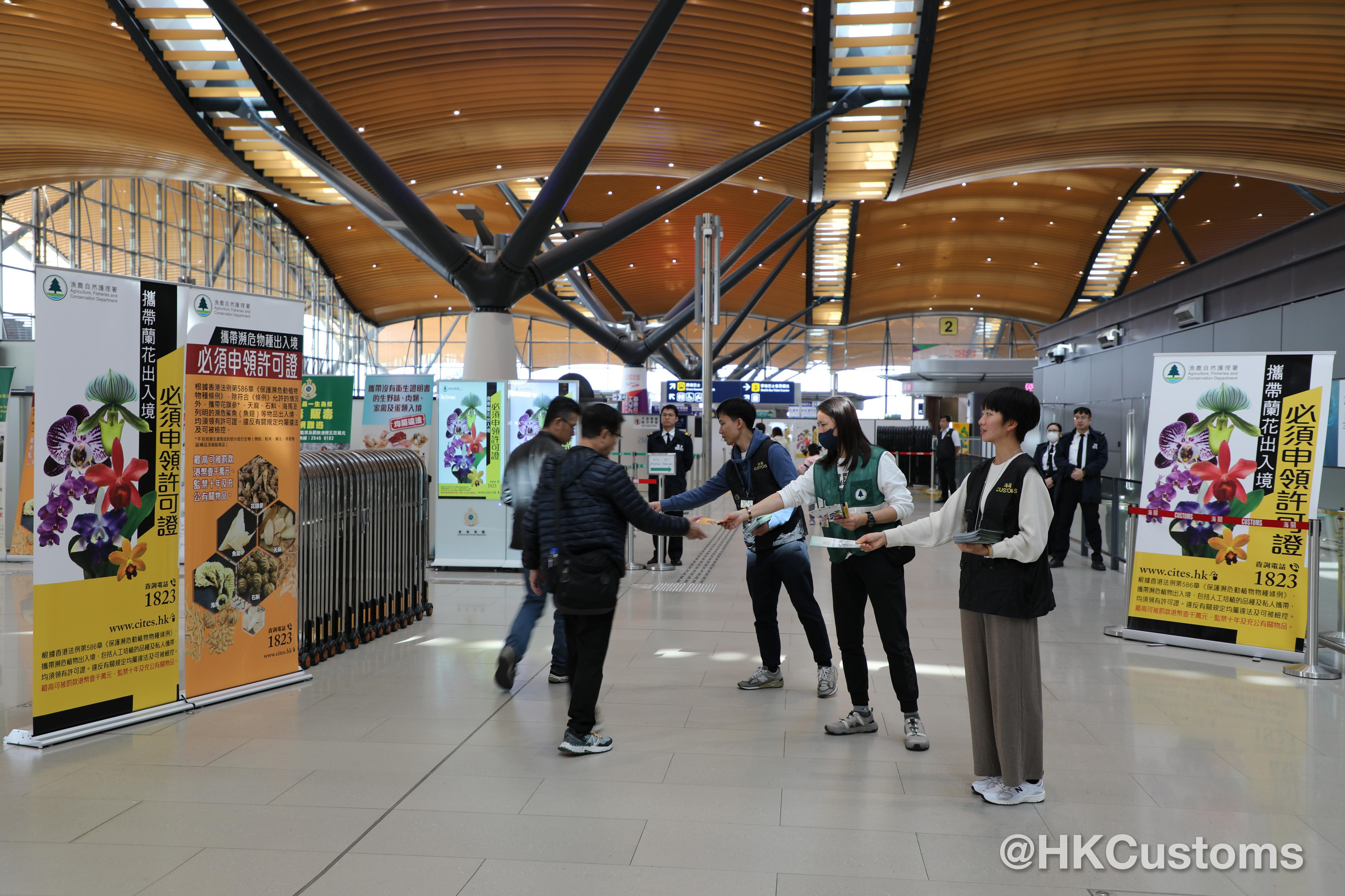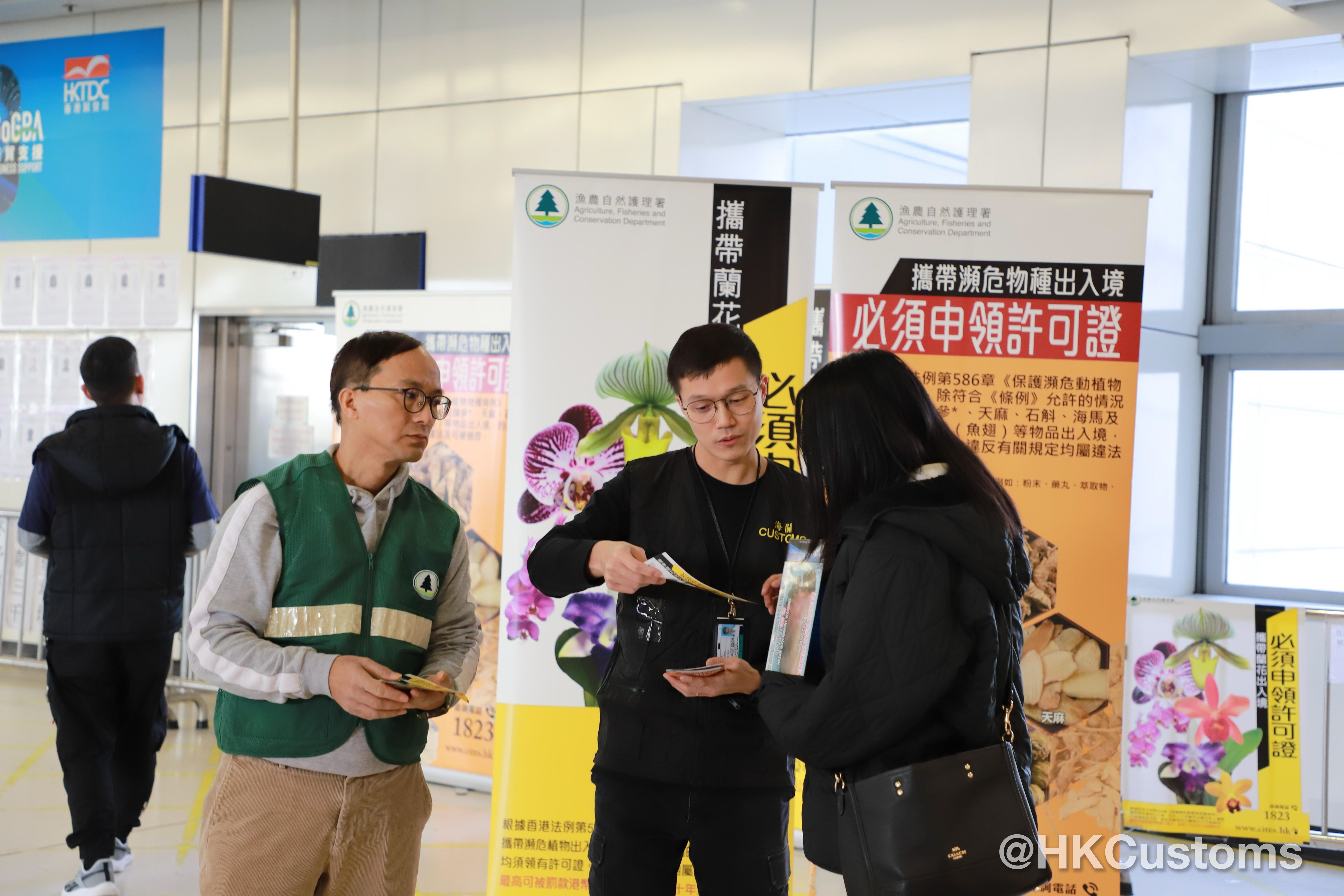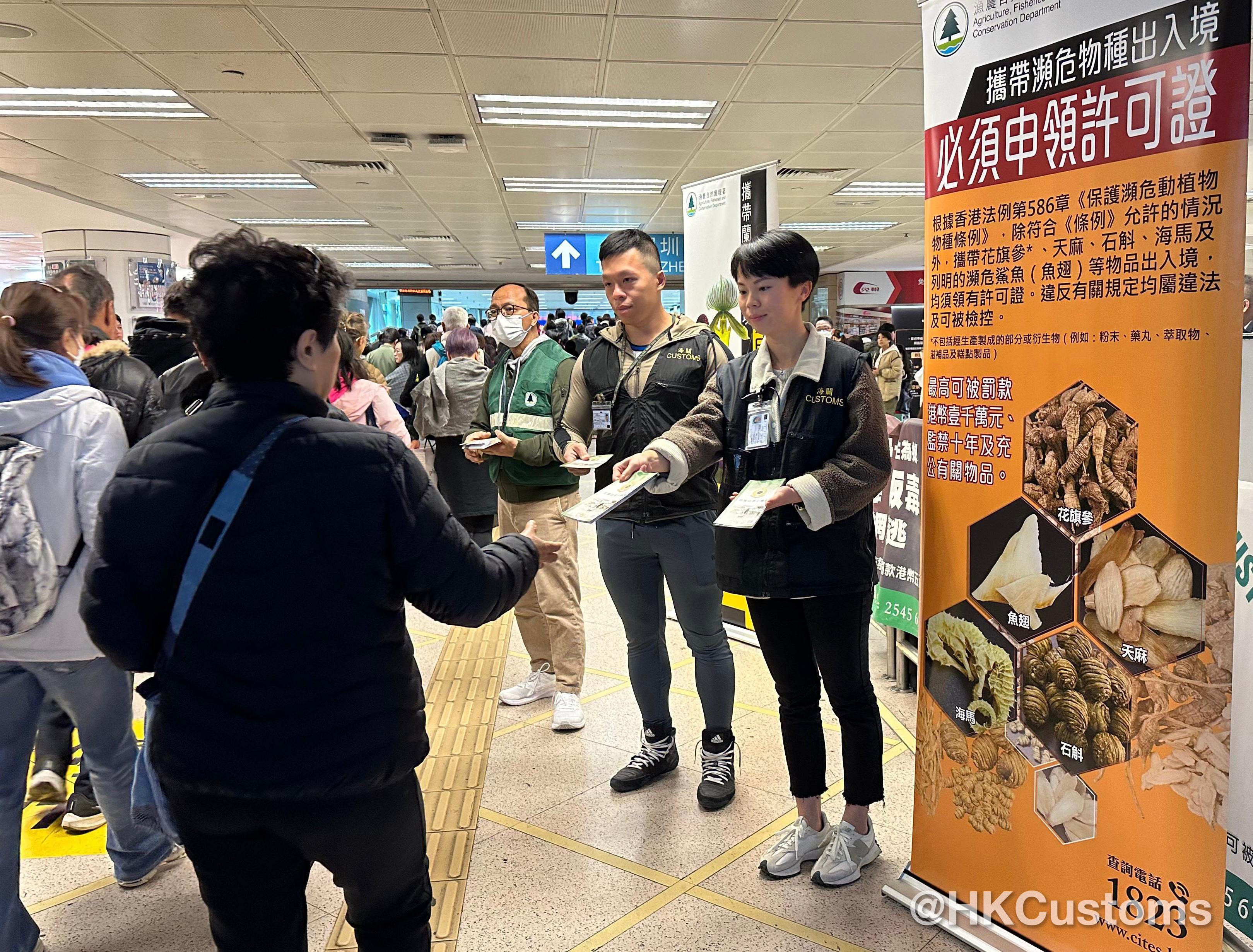 為免市民誤墮法網,海關聯同漁農自然護理署已加強在各陸路邊境口岸的宣傳,並向市民派發《旅客過關小錦囊》 和有關瀕危物種管制傳單,提醒市民各類物品的進出口管制。