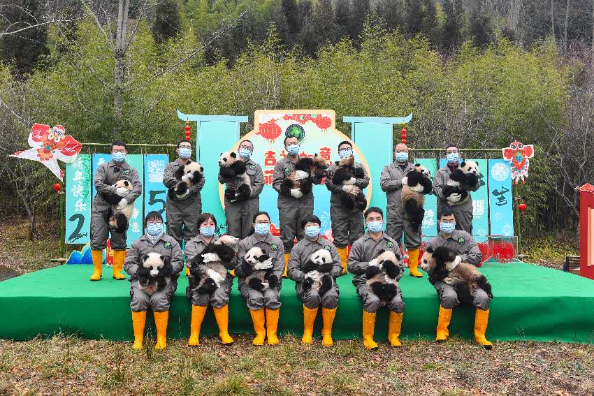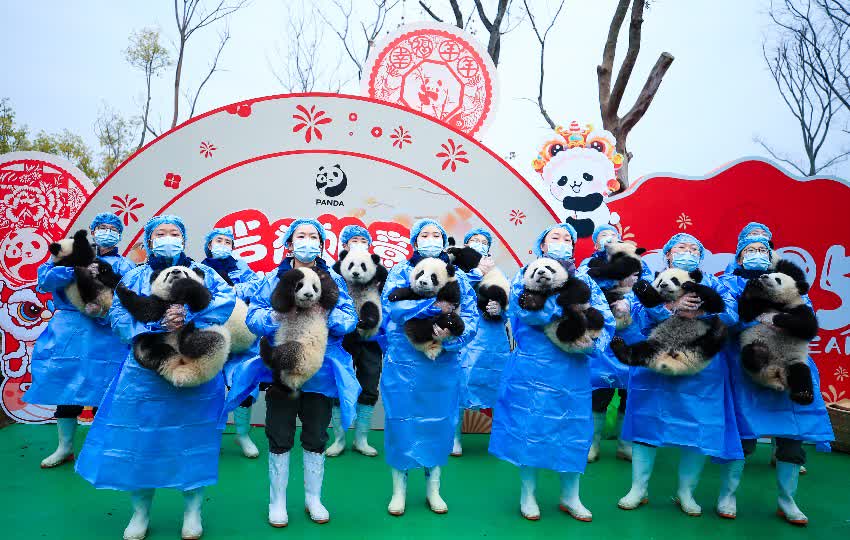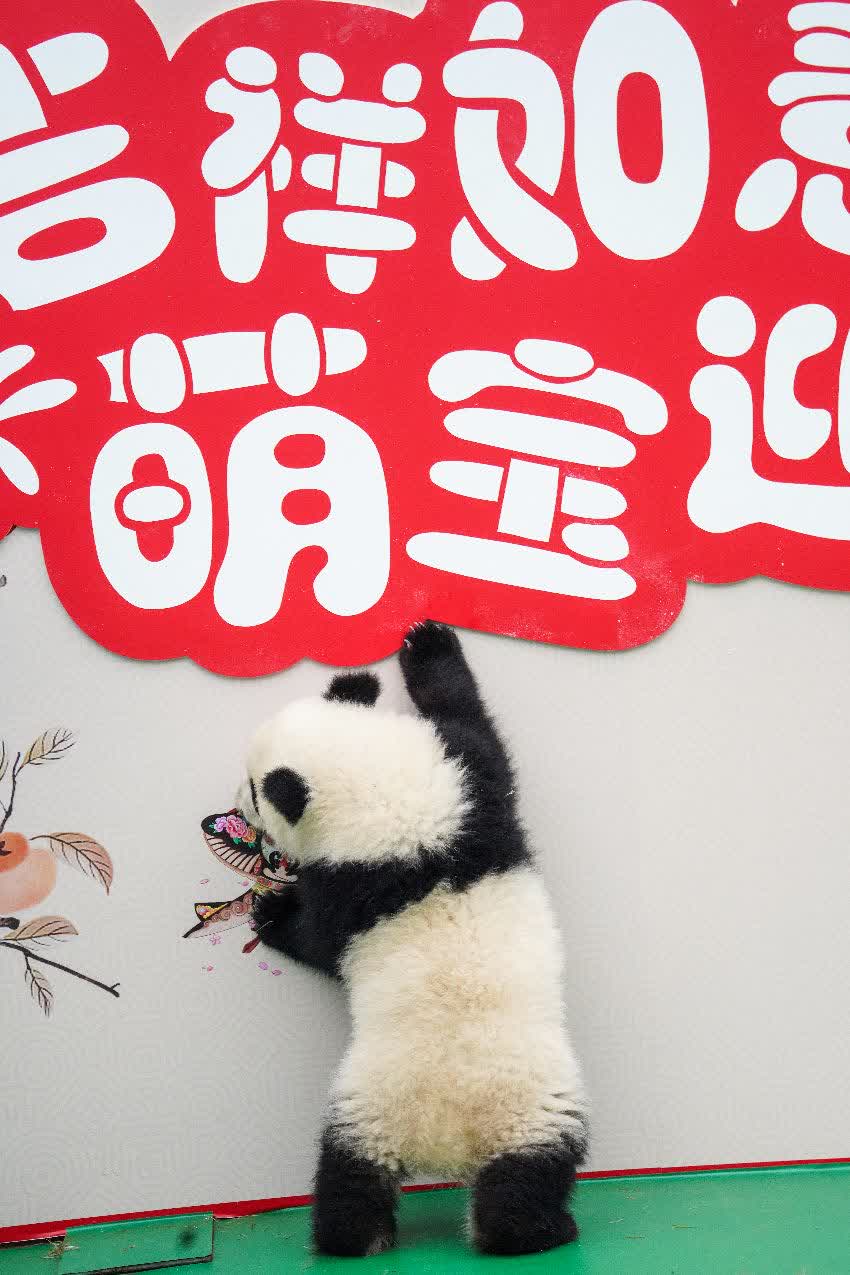 在熊貓中心臥龍神樹坪基地,13只大熊貓寶寶在布置滿了冰糖葫蘆、湯圓、糖畫等中國傳統美食以及剪紙、燈籠、蛇形公仔等新春元素的場地裏好奇探索。在熊貓基地,12只大熊貓寶寶在剪紙、摺扇等非遺元素和新春燈籠及祝福語等傳統元素的喜慶氛圍裏登場。