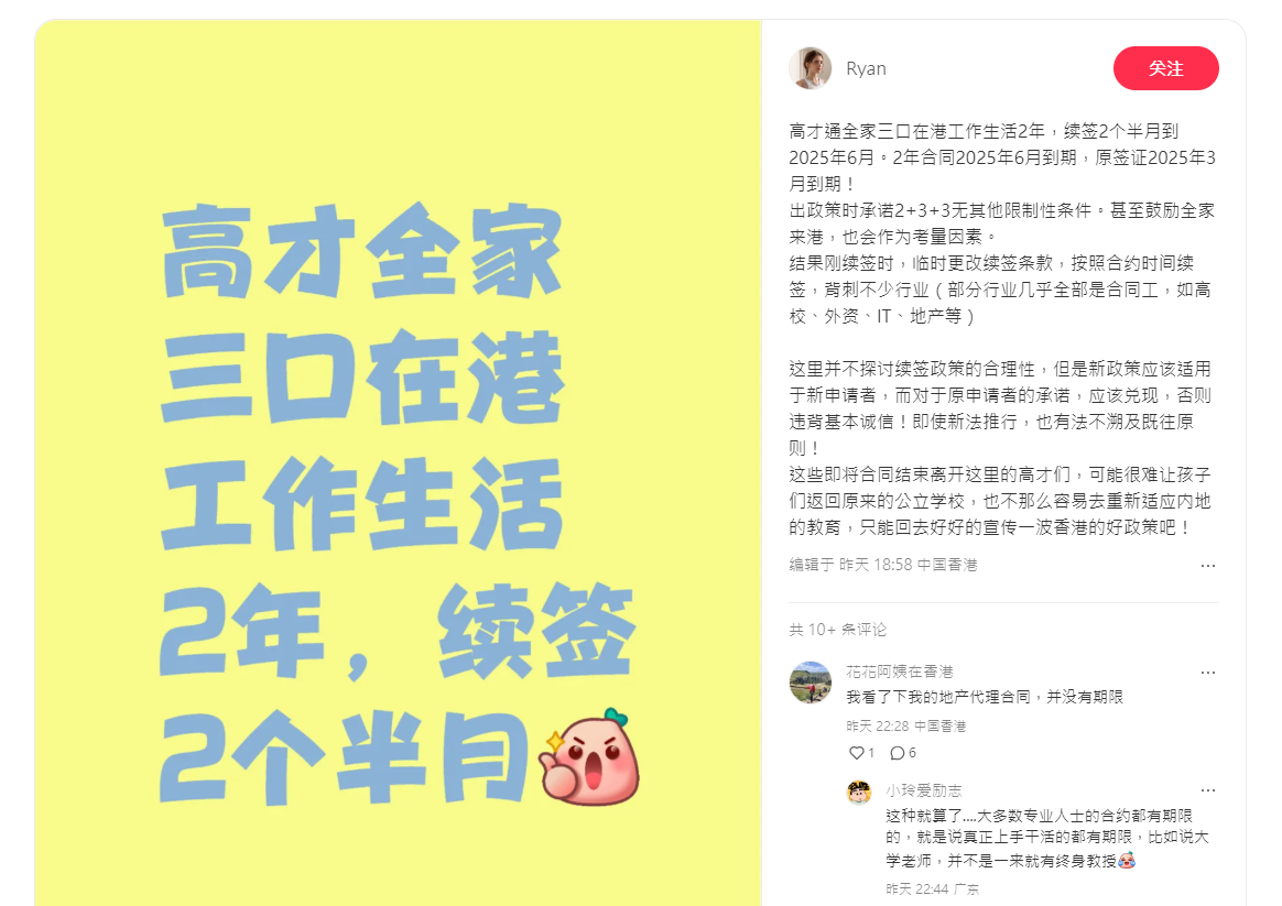 尚海龍續說,事主有小朋友即將於2025/26學年就讀小學,幸好心儀小學通知可以補交簽證資料。他已鼓勵事主不用擔心,如果能繼續以合約形式續約,入境處會按照新合約批出簽證,只是等待時間無比煎熬。尚海龍認為,高才來港,人生路不熟,很需要穩定的環境幫助他們融入社會,而事主的案例喚起許多新來港人才的共鳴,相信隨着越來越多高才需要續簽,會有更多類似的案例出現,希望高才積極尋求協助,反映意見,幫助政府優化政策。