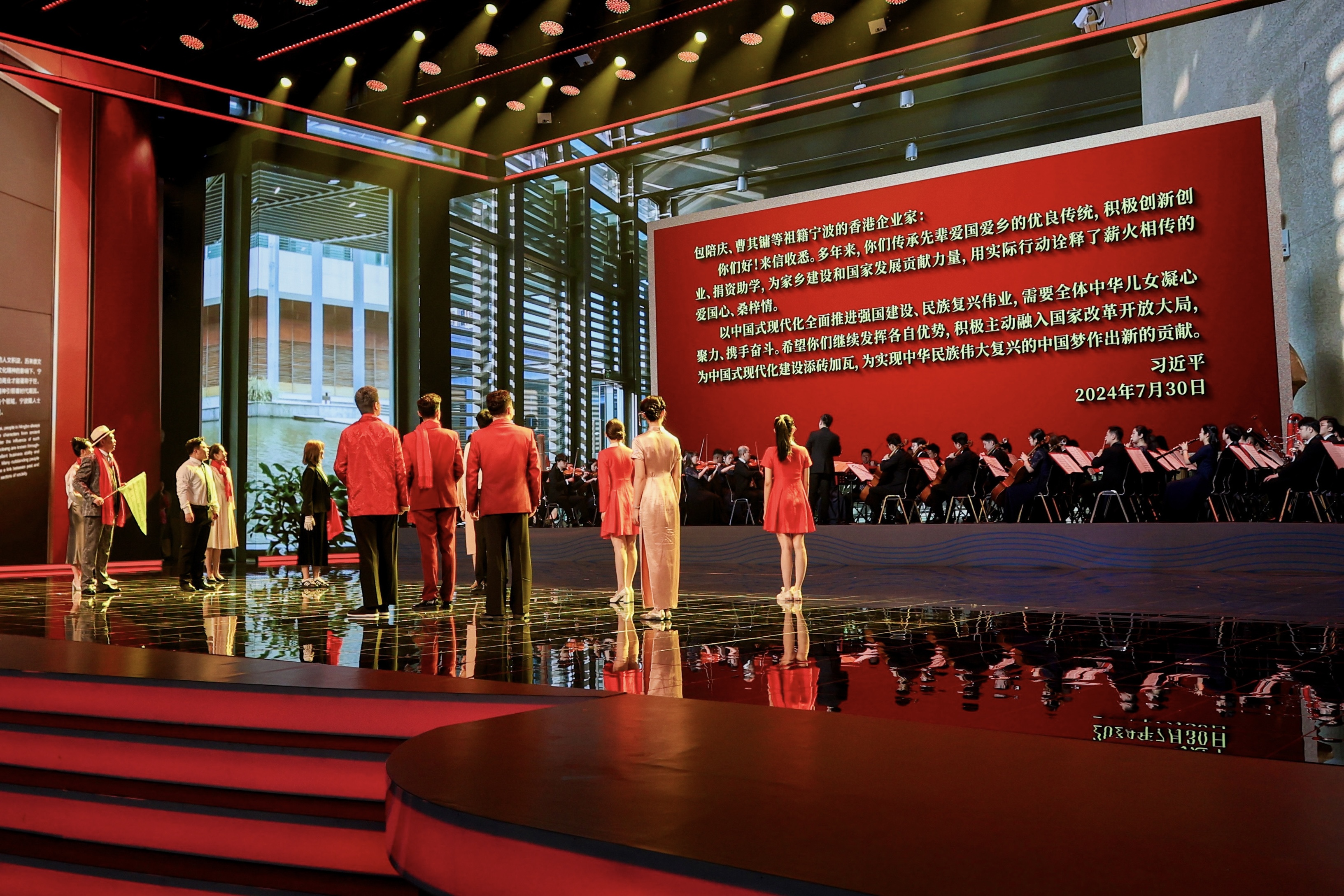 晚會現場,在熱烈氣氛中,一場情景劇開場了,舞台大屏上顯現出燈火通明的寧波幫博物館場景,寧波籍海內外同胞受到習近平主席回信的感召,共同至寧波幫博物館慶祝春節。隨後,在抒情溫暖大氣的樂章中,兩位祖籍寧波的香港企業家深情朗誦,傳遞出「薪火相傳」「接續努力」的新春宣言。