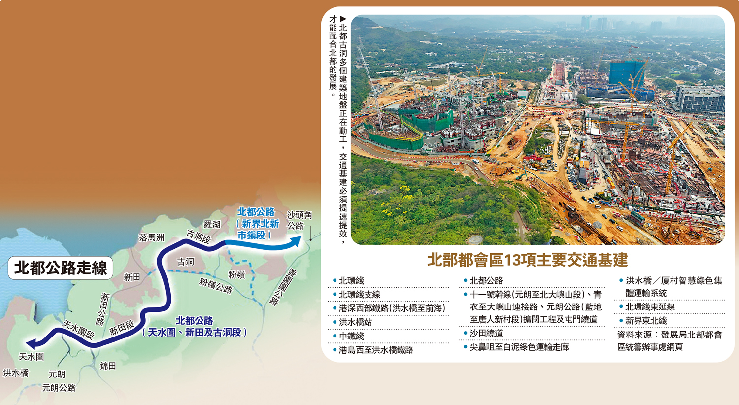 北部都會區將成為香港經濟的新增長點。為加快北都建設,政府在去年11月公布三個「片區開發」的試點方案,並計劃在明年和後年陸續為三個「片區開發」展開招標,基建的配合對北都發展十分重要。北都公路由西至東分別為天水圍段、新田段、古洞段,及新界北新市鎮段,貫通北部都會區內各個發展重心,打通新界北的東西脈絡,形成新的東西走廊,可大幅提升新界北部地區的策略性道路網的運輸效能,並為新發展區建立良好運輸建設的基礎。政府於去年初向立法會提交文件,指北都公路勘查預計需時約38個月,涉資約11.34億元,在立法會交通事務委員會會議上,被議員批評工程造價貴、工時長。