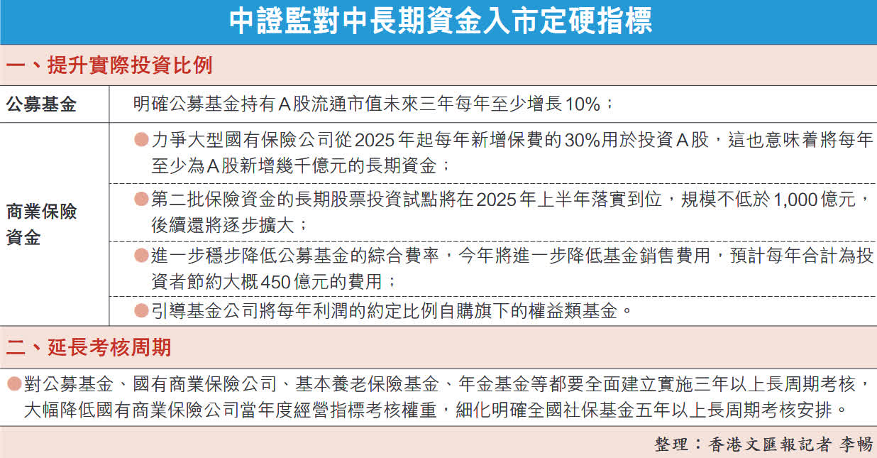 (香港文匯報記者 李暢、章蘿蘭)國務院新聞辦公室昨日上午舉行新聞發布會,中國證監會、財政部和人民銀行等財金部門官員罕有地在A股開盤前同台出席發布會,並罕有地為入市資金設下硬性指標,此舉將為A股市場每年帶來數千億元人民幣增量資金,隨後大盤指數應聲上揚。中證監主席吳清表示,未來三年公募基金持有A股流通市值每年至少增長10%;對於商業保險資金,力爭大型國有保險公司今年起每年新增保費的30%用於投資A股。今年起還將進一步降低基金銷售費率,預計每年合計可為投資者節約450億元(人民幣,下同)費用。有專家分析指,新措施單是今年就可帶來萬億元增量資金,給予投資者定心丸,實現A股「慢牛」財富效應。