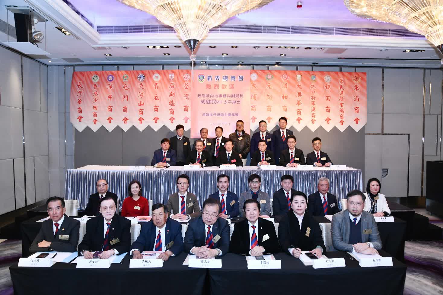 新界總商會日前舉行了第十五屆董事會第九次會議,政制及內地事務局副局長胡健民擔任主講嘉賓,分享政制及內地事務局的工作,說明「一國兩制」是如何在香港實踐,並介紹內地與香港的關係,以及粵港澳大灣區發展。會長張德熙,主席曾智明,事務委員會主席彭志宏,會務委員會主席周駿達,副會長周華焯、何光耀、梁鐵夫、齊光華、李國強、葉沛霖、宋玲鋆、廖齡儀、司徒立、蔡卓軒、林筱旻、盧官佃,副主席黃志源、朱德榮、梁金塘、陳安立、吳斯維、馬沛強、黃凱斌,會務顧問王基源、陳子政,中醫顧問彭祥喜等80人參加會議。