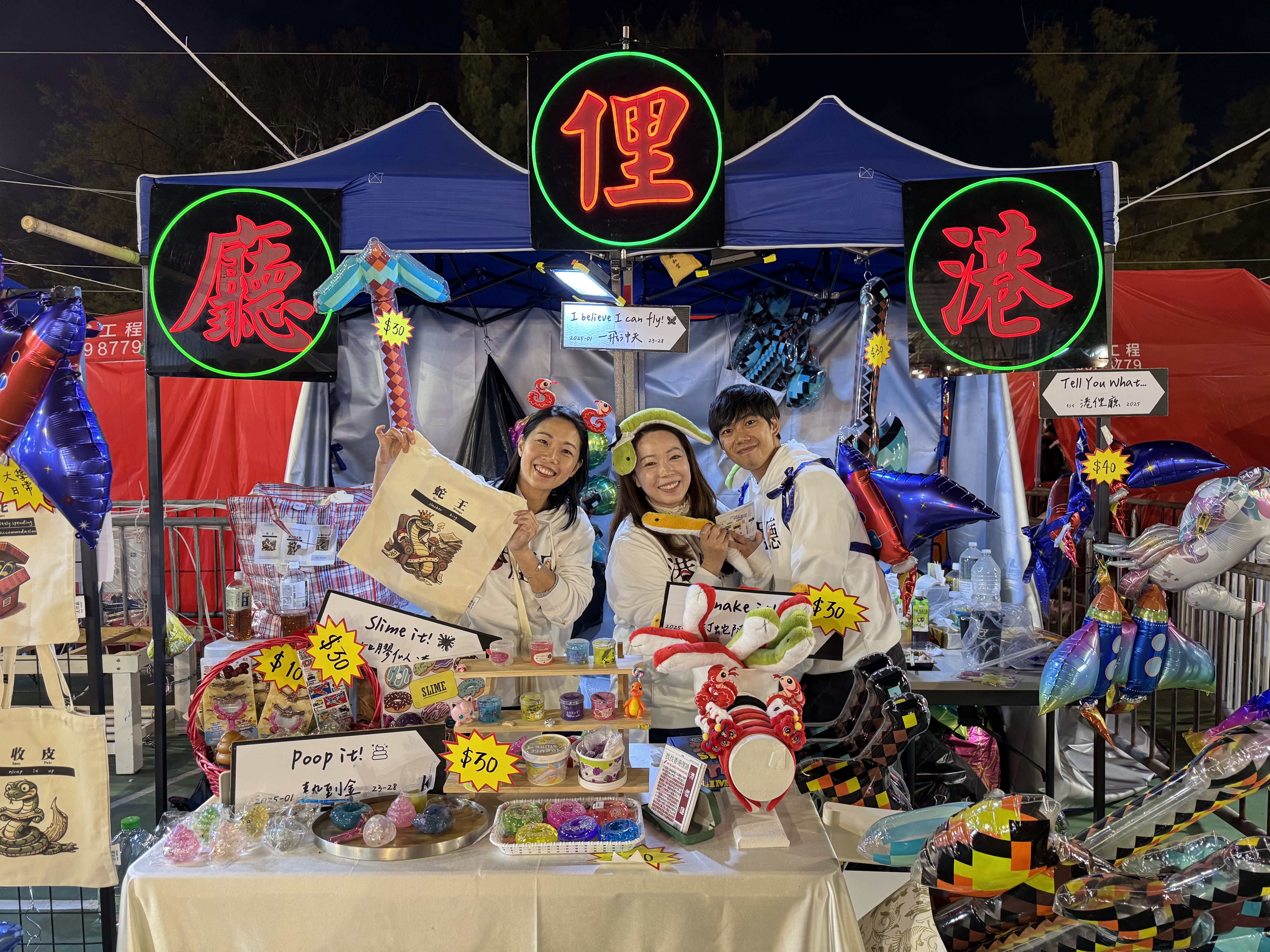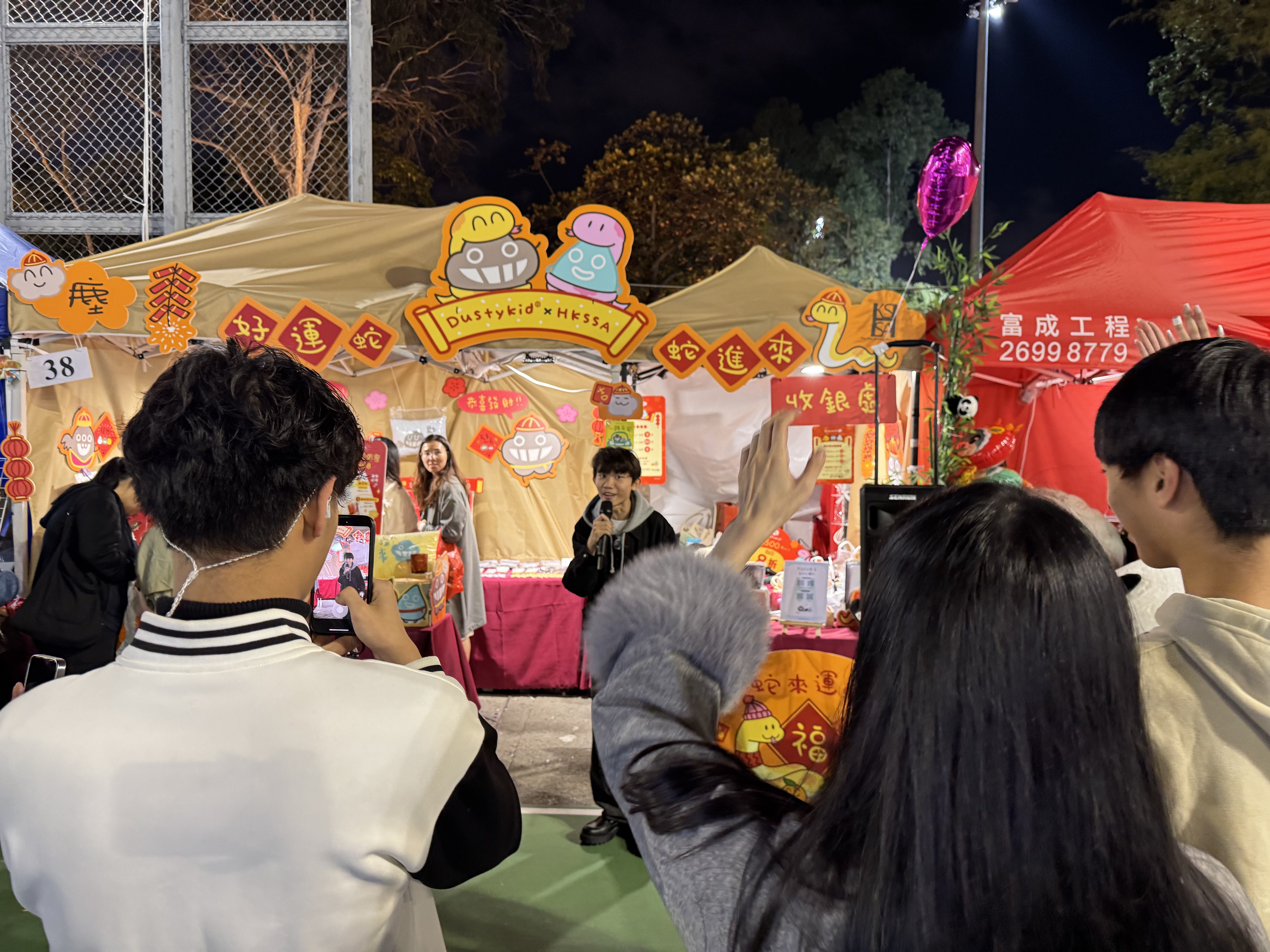 年宵市場的商戶黎小姐表示,她從中午12點就開始擺攤了,店舖內的文創產品都與香港的俚語有關,也想藉此推廣香港俚語文化,像攤位上的帆布袋和鮮豔可愛的小蛇都非常受年輕人和小朋友的喜愛。黎小姐認為今年的年宵市場氛圍很好,有很多學生參與,讓市場變得更有創意。