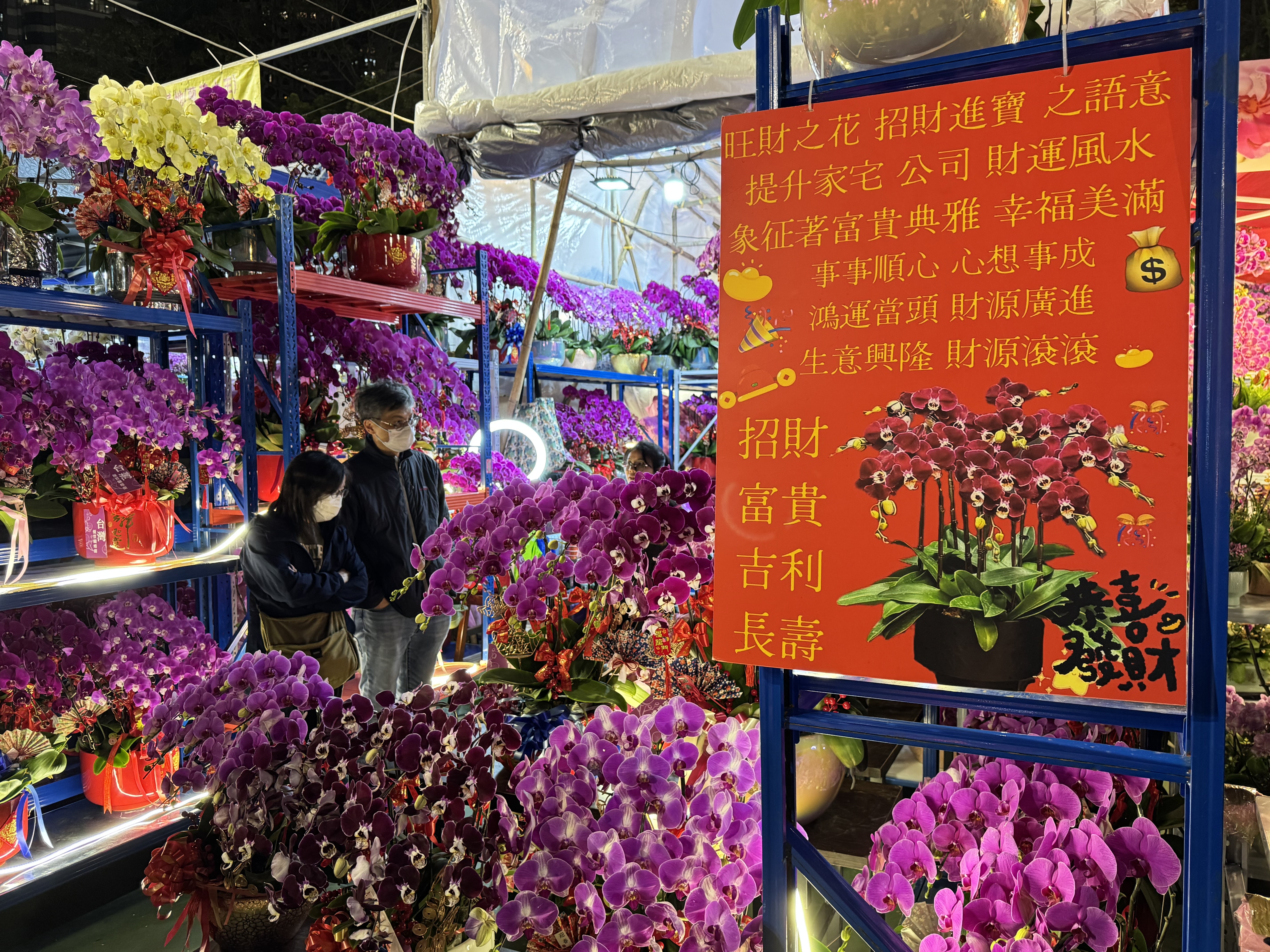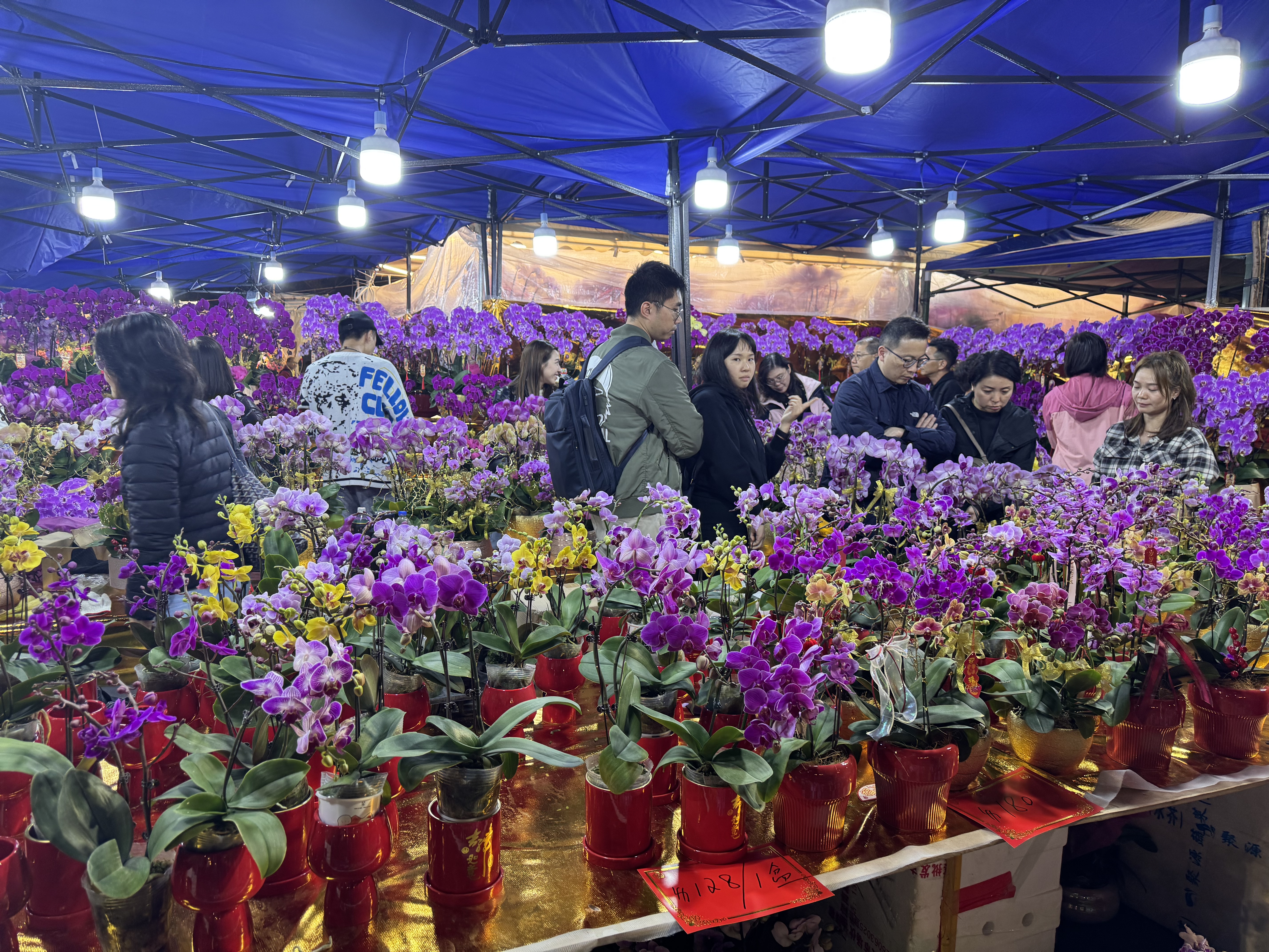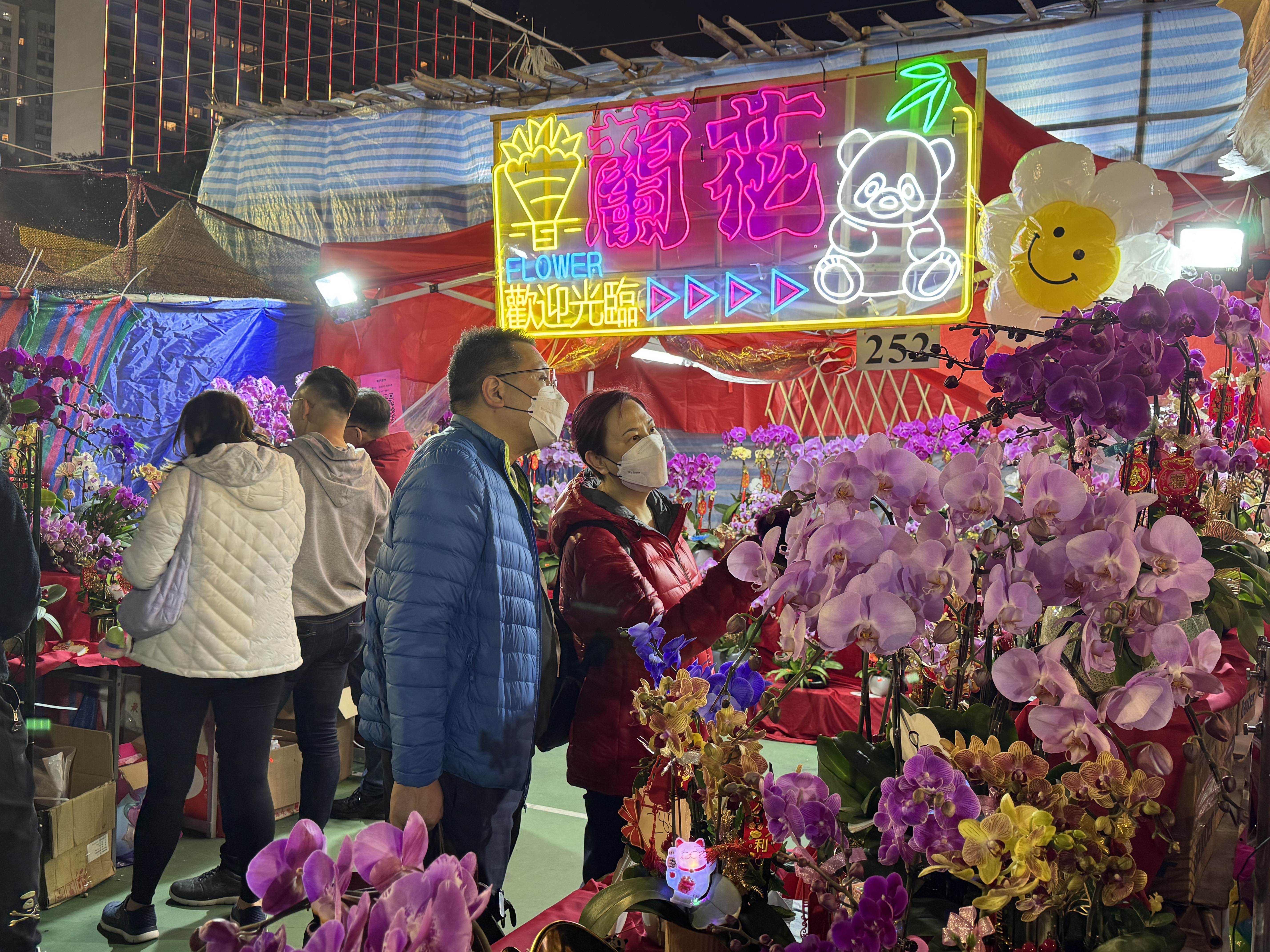 天色已晚,維園亮起了彩燈,市民和遊客穿梭於喜氣洋洋的貨品和新鮮花束之間,節日氛圍濃厚。攤位種類繁多,有美食、年貨、新年裝飾、花卉、文創產品、零食等等,共有逾300個攤位。