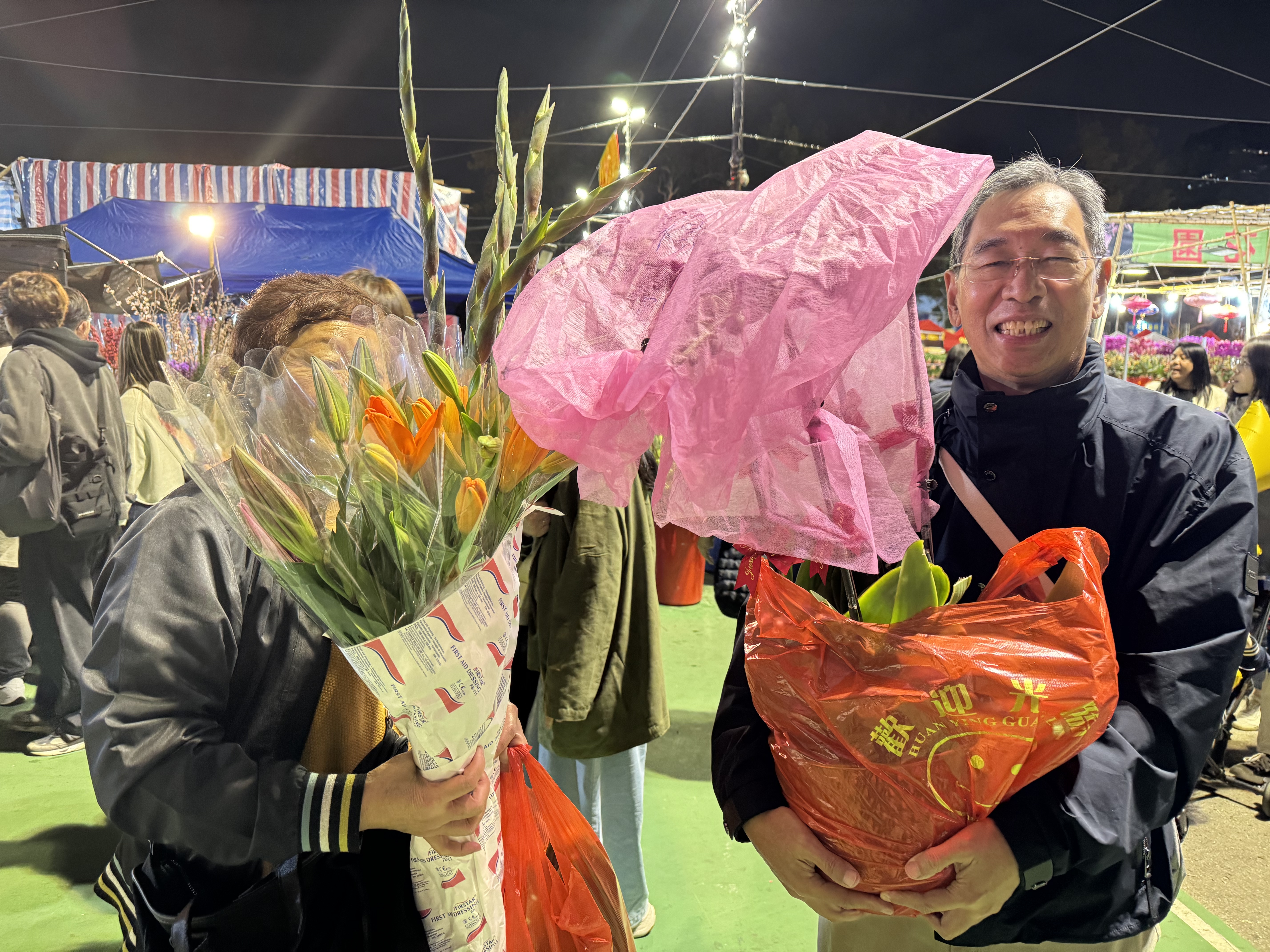待到今天的攤位快收攤時,許多市民都抱着買到的「寶貝」滿意而歸。楊先生和太太今天來逛年宵市場,買到了蝴蝶蘭、劍蘭和百合。楊先生說,買花寓意着花開富貴,有好彩頭。他還說今年來得早,花就新鮮點,以前年年都會來逛,不過都比較晚,除夕那天花也會便宜些。