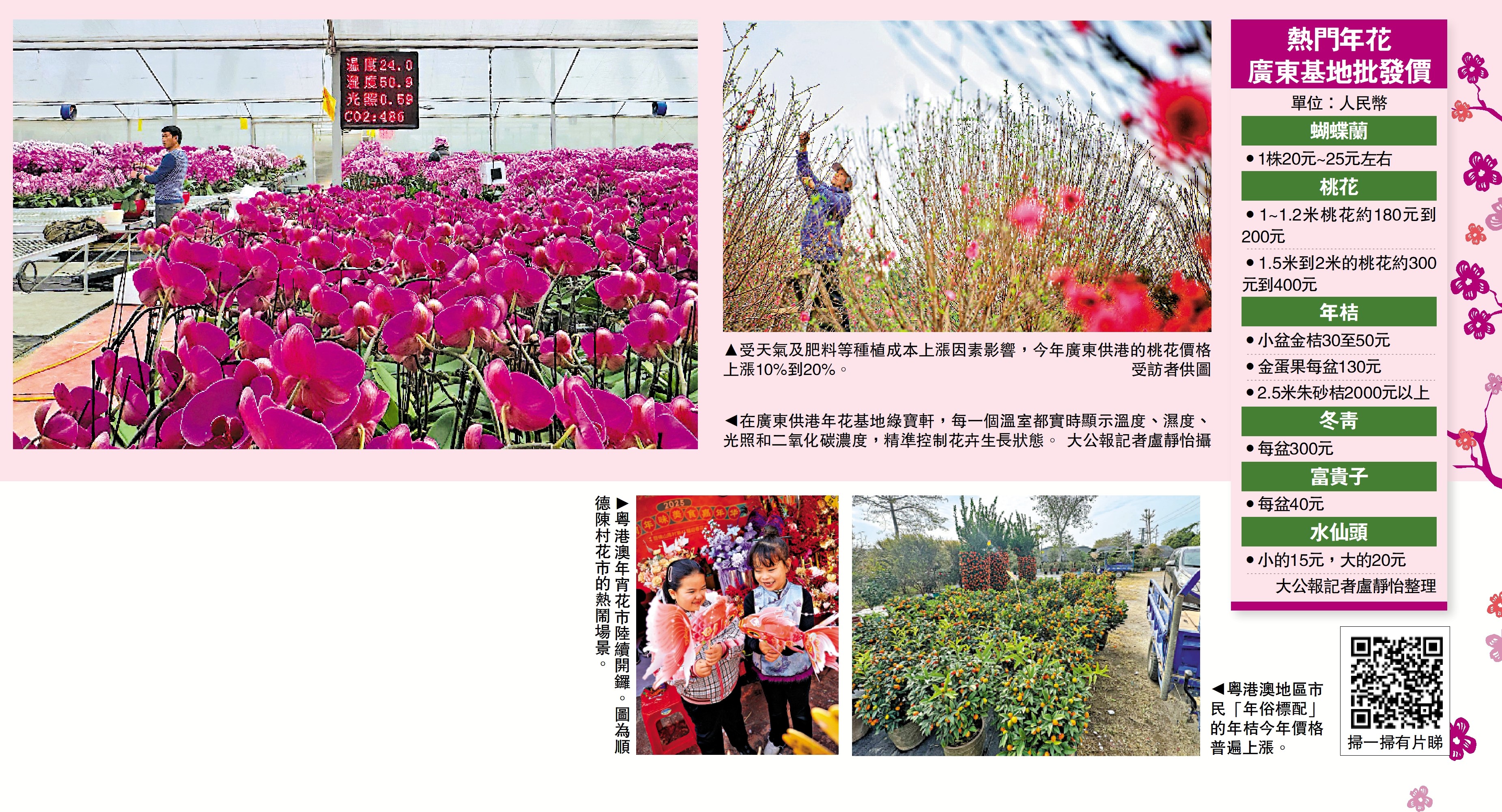 與年桔相似,今年桃花價格亦有所上漲。在廣州市荔灣區,有一片粉紅色的「世外桃源」,這裏正是部分供港桃花的種植基地。「今年雨水少,花期來得相對較遲。」種植桃花多年的花農盧叔告訴記者,今年他種植了將近600棵桃花,不少銷往香港市場。「我們1.2米的桃花全部專供香港市場。這周大部分桃花已經裝車運往香港。」據他介紹,今年桃花的價格相比去年上漲了10%-20%,原因主要跟天氣及肥料等種植成本上漲有關。