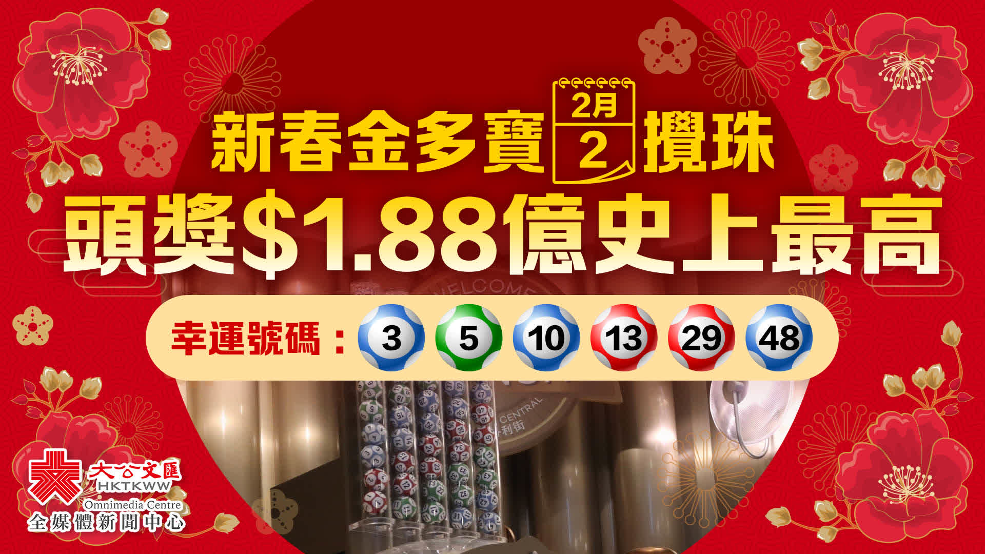 大公文匯全媒體報道,農曆新年將至,想發個新年財,機會又來啦!六合彩新春金多寶攪珠將於2月2日(年初五)舉行,特設1.5億港元金多寶,若以10港元一注獨中,估計頭獎基金高達1.88億港元,是史上最高的頭獎彩金,亦是歷來最大規模的新春金多寶。