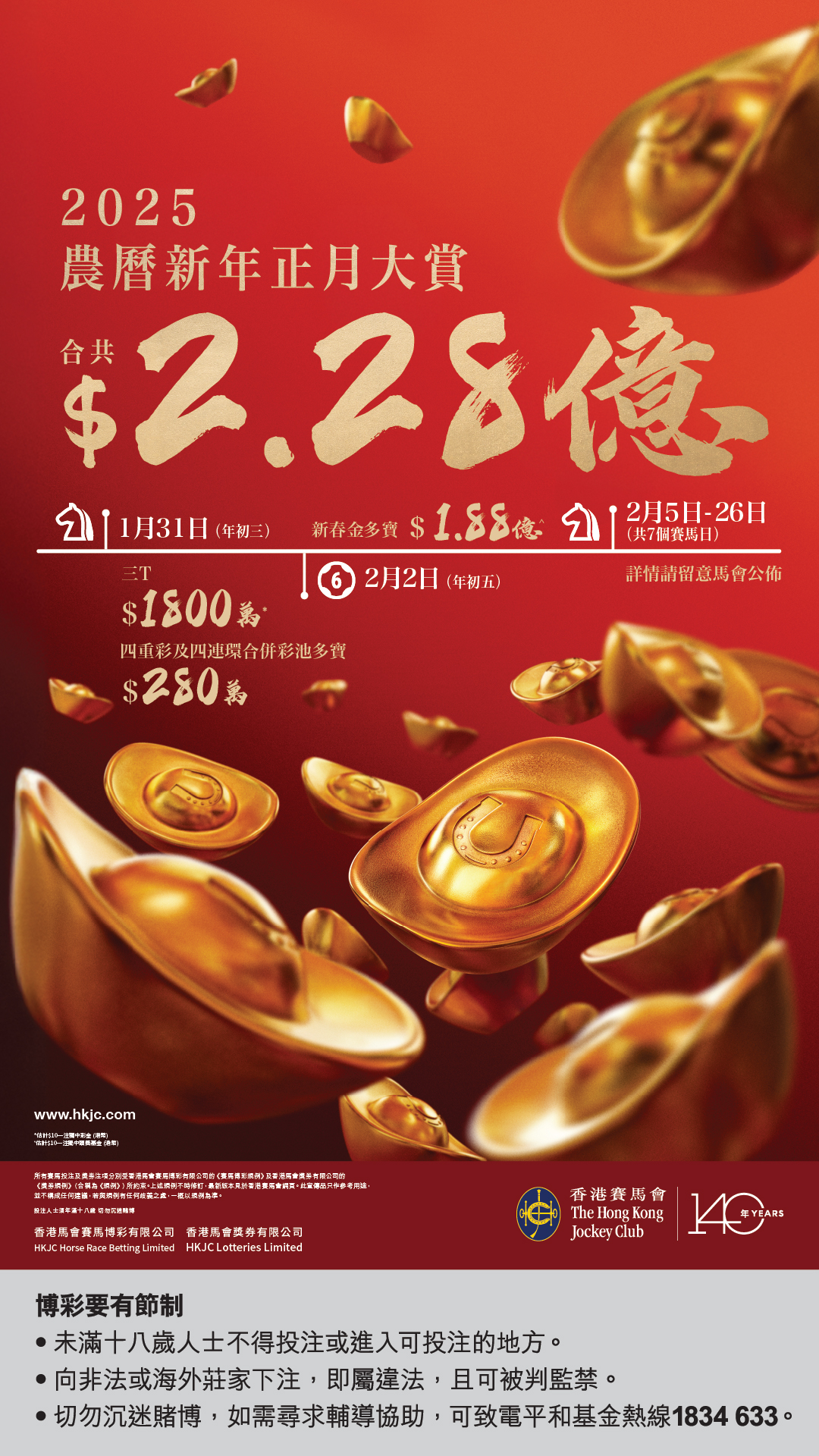 此外,為同賀新春,賽馬會將於農曆新年正月,提供高達合共2.28億港元的新春大賞,包括農曆新年賽馬多寶,預計彩金達2080萬港元賽馬多寶,送龍迎蛇。