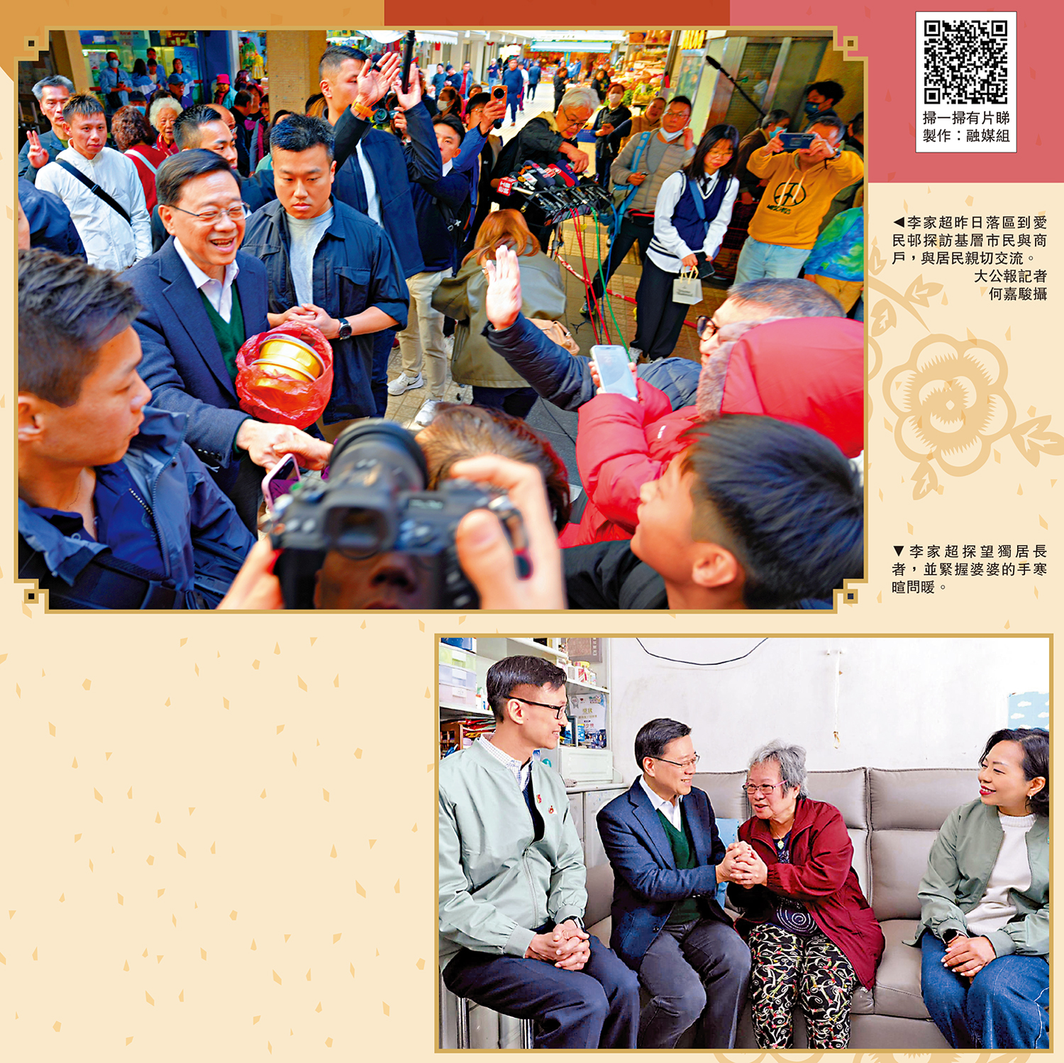 (大公報 記者 吳俊宏)年近歲晚,送龍迎蛇之際,行政長官李家超及司局長展開走訪全港十八區活動,探訪不同家庭,了解他們的居住和生活狀況,為大家送上賀年福袋,送上關愛,共慶新春。在何文田愛民邨,李家超為當區關愛隊家訪和大掃除活動加油打氣。他向邨內長者拜早年、與商戶和市民互道新年祝福,氣氛熱烈且融洽。