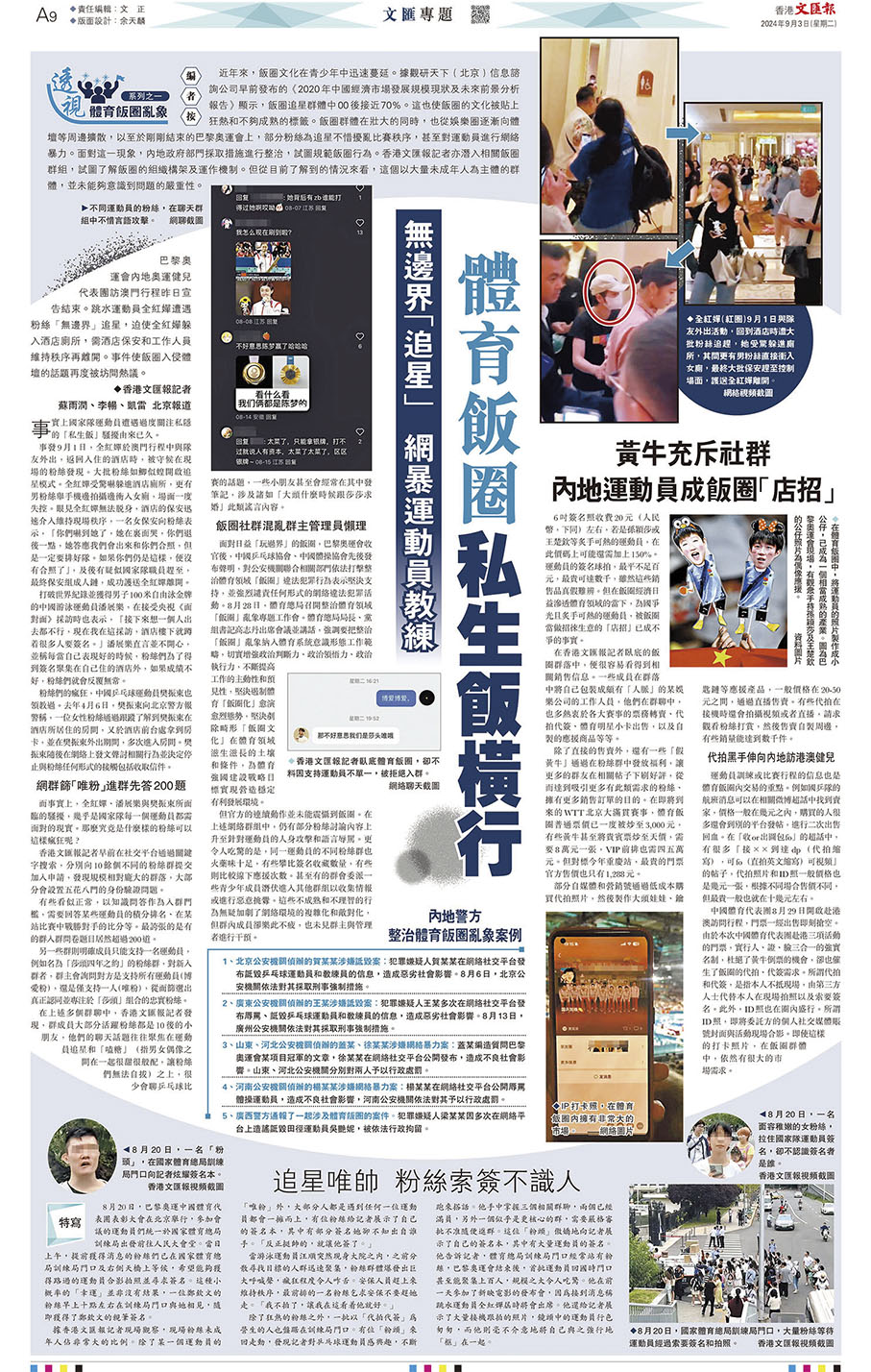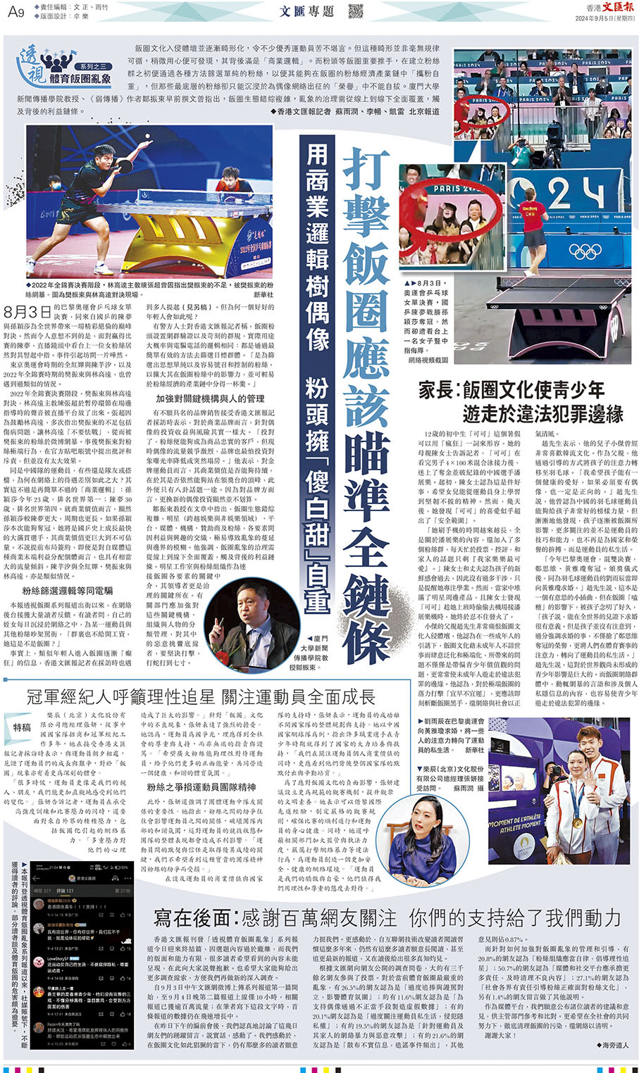 香港文匯報報道,針對「飯圈」亂象侵蝕和影響乒乓球項目的問題,中國乒協、中國乒乓球隊始終態度鮮明地堅決抵制,把整治「飯圈」亂象納入體育系統意識形態工作範疇,一致決定解散官方粉絲群,並將範圍擴大至全體人員、全部社交平台,以抵制畸形的「飯圈文化」,世界「一姐」孫穎莎亦呼籲球迷多多聚焦賽場,將焦點放在運動員們在賽場上的表現。