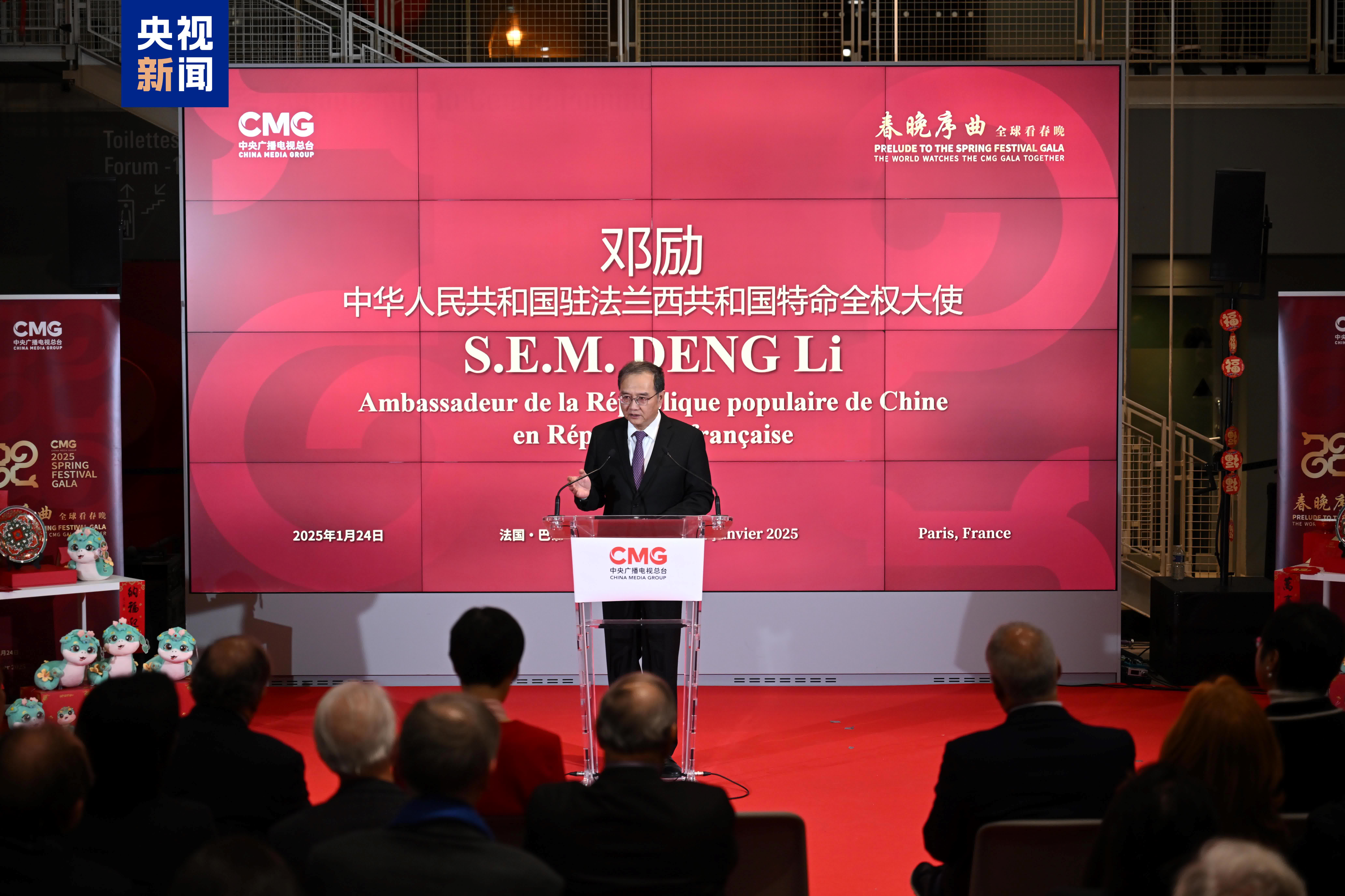 據央視新聞報道,當地時間1月24日,中國中央廣播電視總台「春晚序曲 全球看春晚」活動法國專場在巴黎舉行。中宣部副部長、中央廣播電視總台台長慎海雄作視頻致辭。中國駐法國大使鄧勵,聯合國教科文組織文化助理總幹事埃內斯托·奧托內,法國蓬皮杜國家藝術和文化中心主席洛朗·勒龐出席活動並致辭。中國常駐聯合國教科文組織大使銜代表楊新育,法國著名紀錄片導演雅克·馬拉特,法國席勒研究所研究員、國際問題專家塞巴斯蒂安·佩里莫尼,法國絲路出版社社長索尼婭·布雷斯勒等各界友好人士近200人參加活動。