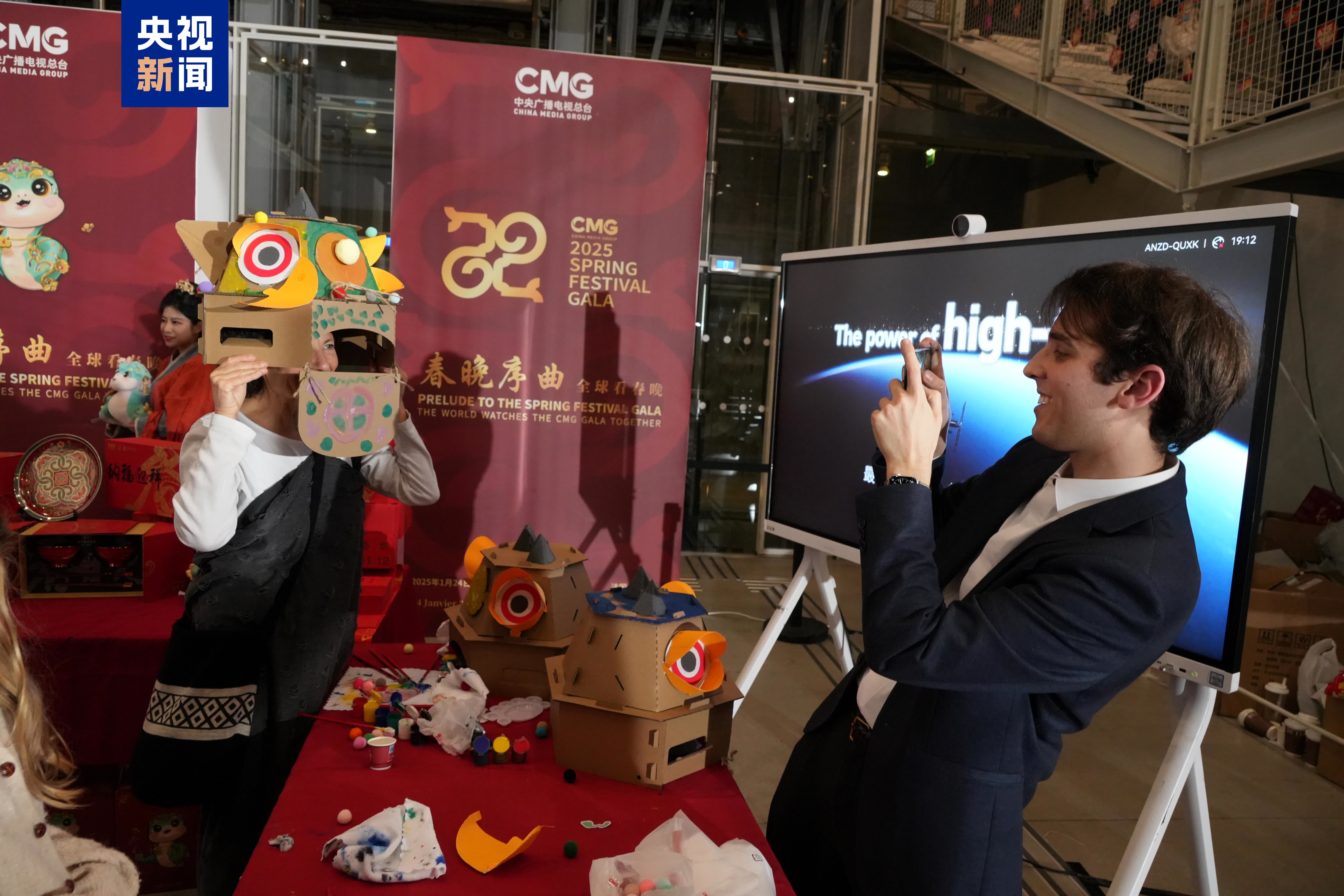 當天的活動還在場外設置了互動專區,中法青少年聯合製作廣東省非物質文化遺產「貓頭獅」。現場嘉賓爭相體驗皮影戲、剪窗花、寫福字等中國傳統年俗。