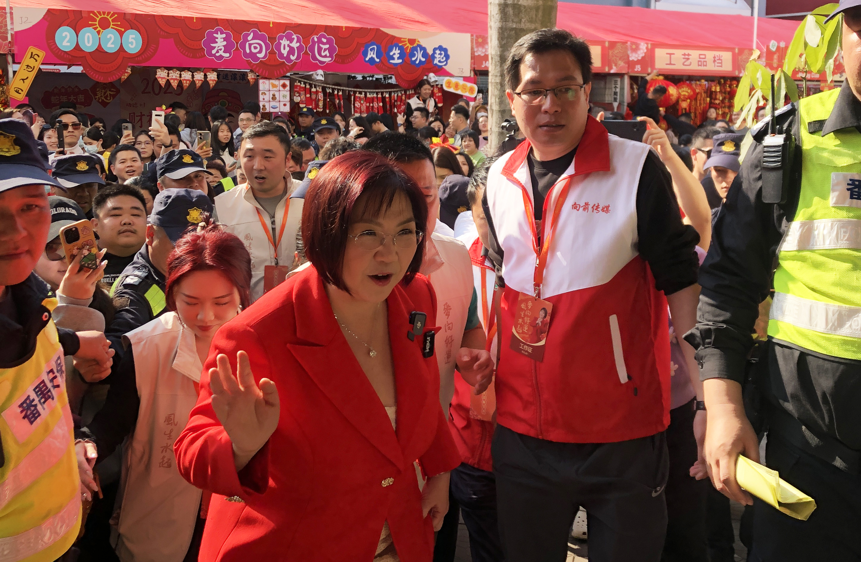 進入花市牌樓,一排排鮮紅色彩的花市檔位棚架展現在眼前,年桔花卉檔位、工藝品檔位、公益檔位、年貨食品檔位、茶飲咖啡檔位、非遺潮玩檔位等分類別排列,引得市民遊客不時駐足觀賞、選購。