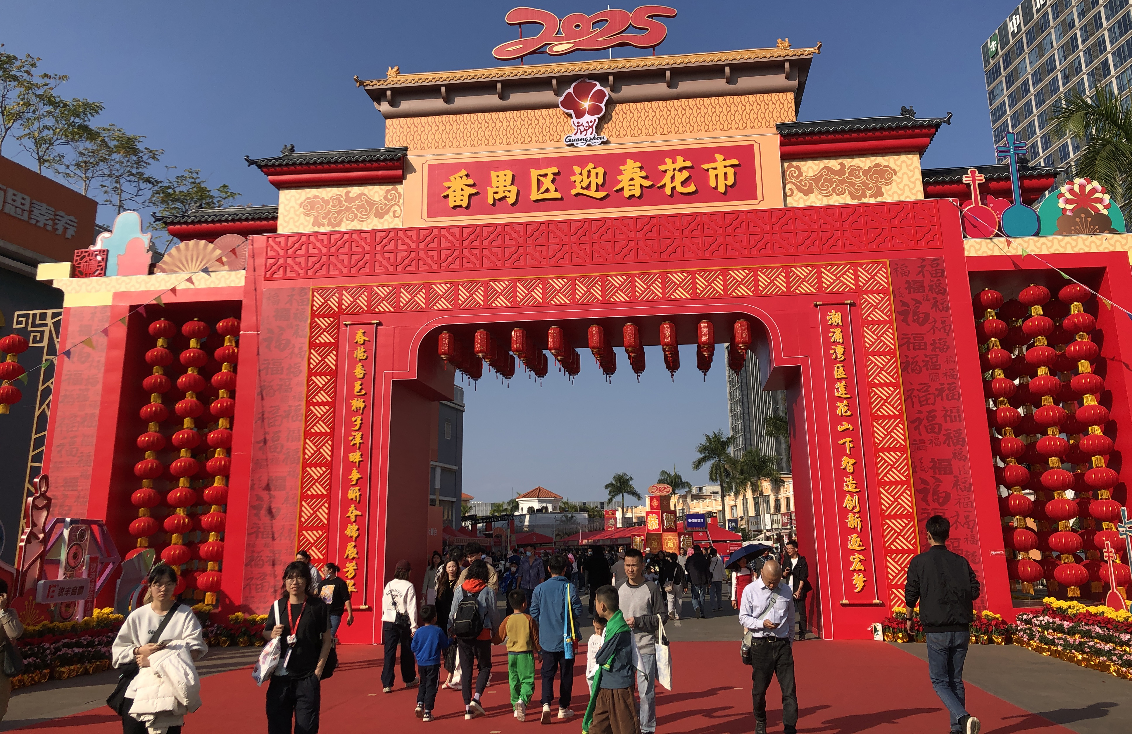 走近2025年番禺區迎春花市主會場,只見花市牌樓設計在參照番禺傳統建築牌樓風格基礎上,融入喜氣洋洋的「大紅燈籠高高掛」的理念,代表着「萬家燈火家團圓」的新年期許。鎏金的瓦頂靈感來自寶墨園建築,屋脊兩端各置一條鰲魚,寓意年年有餘、獨佔鰲頭、生活富足、太平盛世。一幅「潮湧灣區蓮花山下智造創新逐弘夢 春臨番邑獅子洋畔爭妍奪錦展芳華」的新春對聯,分兩側沿百「福」圖立柱垂直展下,站位高遠、催人奮進。
