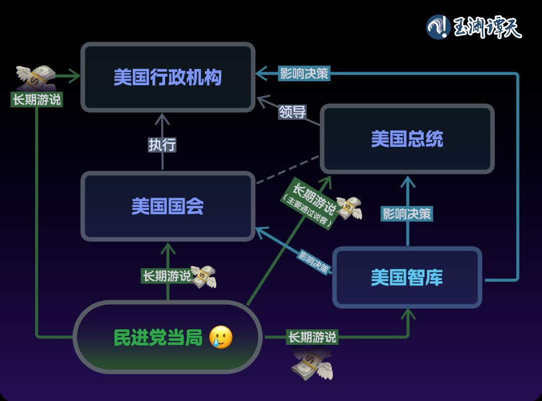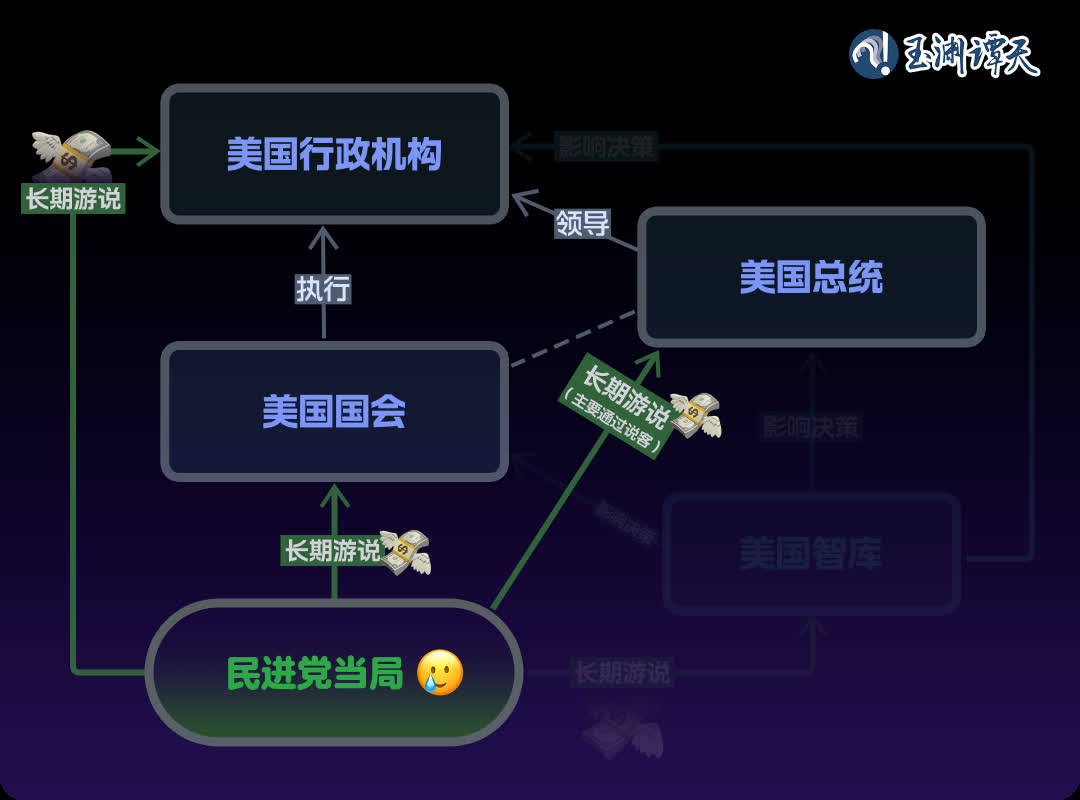 譚主梳理了一張民進黨當局滲透美國涉台決策的流程圖: