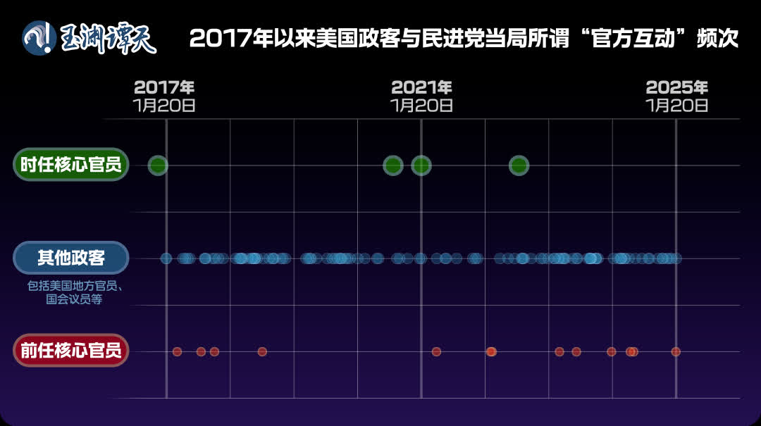 譚主梳理了2017年以來民進黨當局與這些政客公開的所謂「官方互動」,包括美國政客竄台、與民進黨當局見面、通話等。