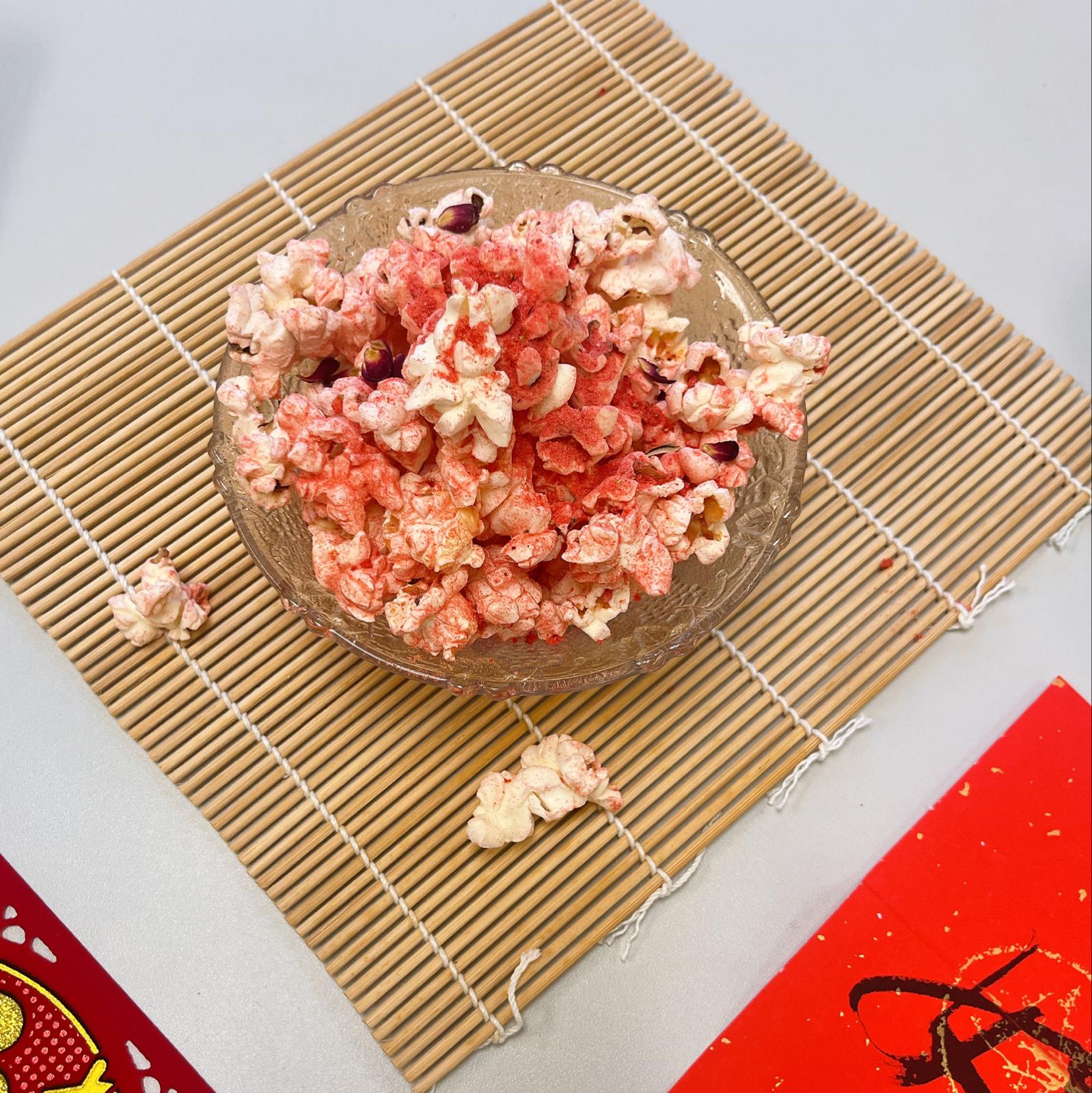 - 冷凍乾燥草莓放入塑膠袋壓碎成粉狀,將其與爆谷混合。最後加少許鹽調味