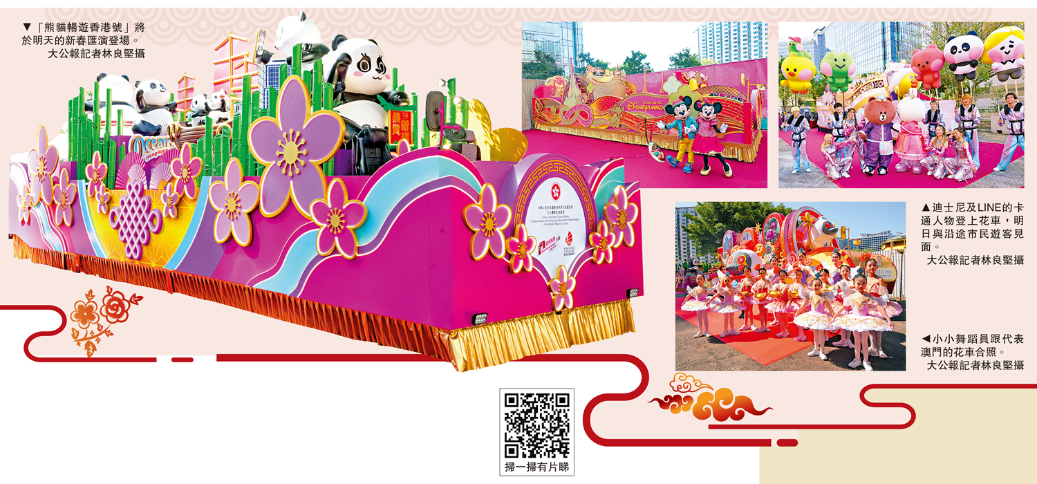 代表文化體育及旅遊局、旅發局,以及海洋公園的花車,名為「熊貓暢遊香港號」,全長約六米、高三米,六隻大熊貓裝置模型坐在花車上,預料將成為焦點;匯演壓軸出場的花車由旅發局設計,以「如意新春,喜樂連連」為主題,以蛇的形態為靈感,並會有流動發光的如意環穿梭香港,寓意全城連接福運、好事環環相扣。