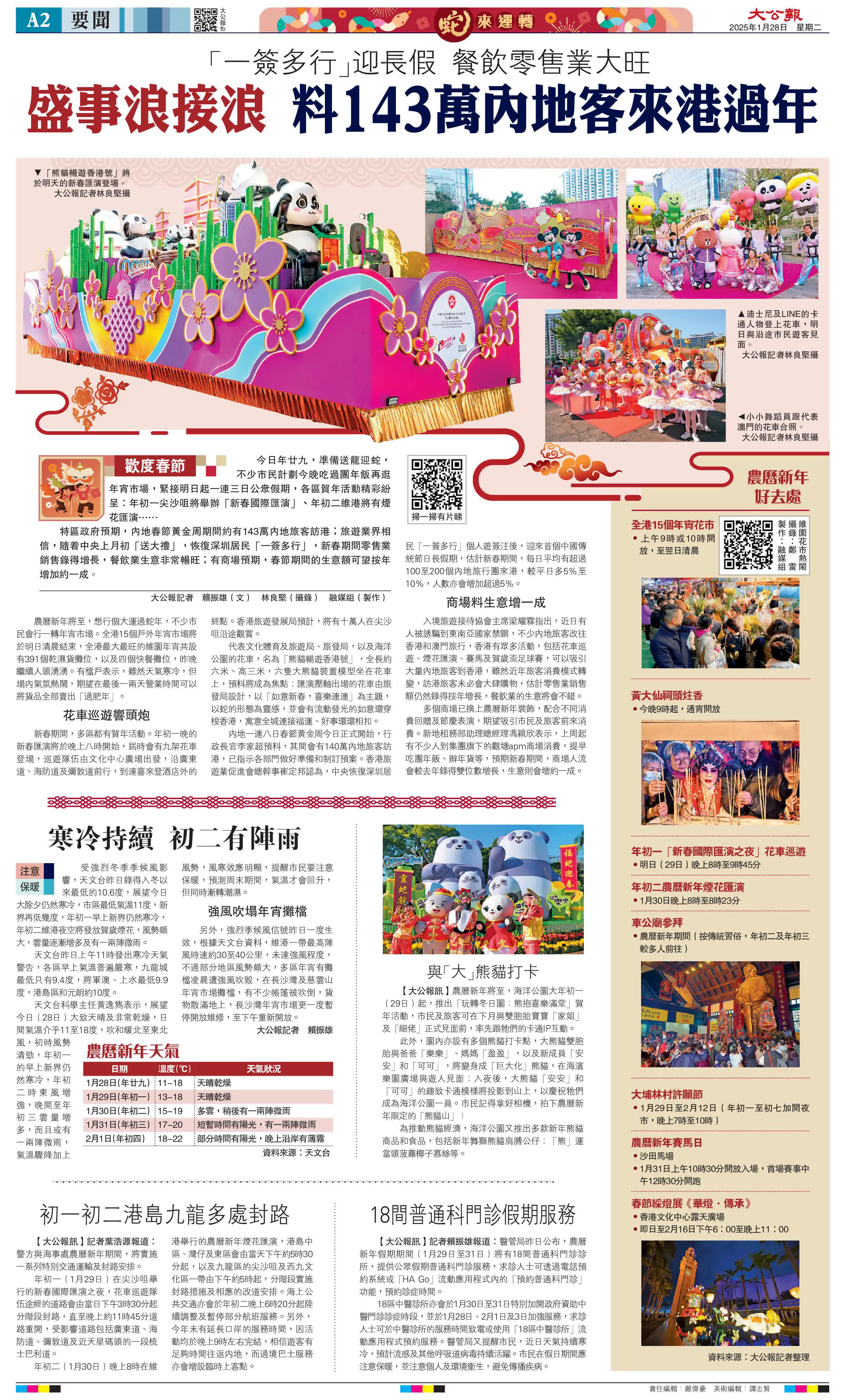 【大公報記者 賴振雄(文) 林良堅(攝錄) 融媒組(製作)】今日年廿九,準備送龍迎蛇,不少市民計劃今晚吃過團年飯再逛年宵市場,緊接明日起一連三日公眾假期,各區賀年活動精彩紛呈:年初一尖沙咀將舉辦「新春國際匯演」、年初二維港將有煙花匯演……