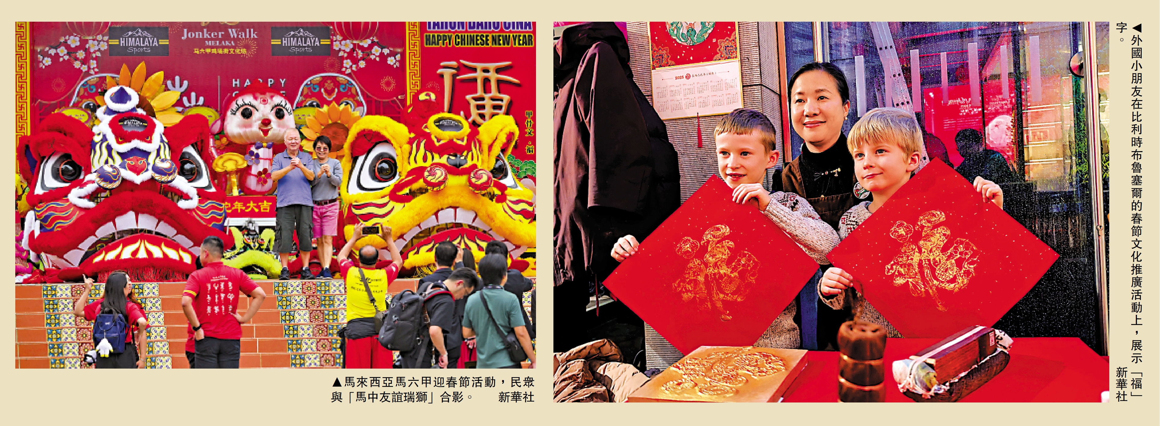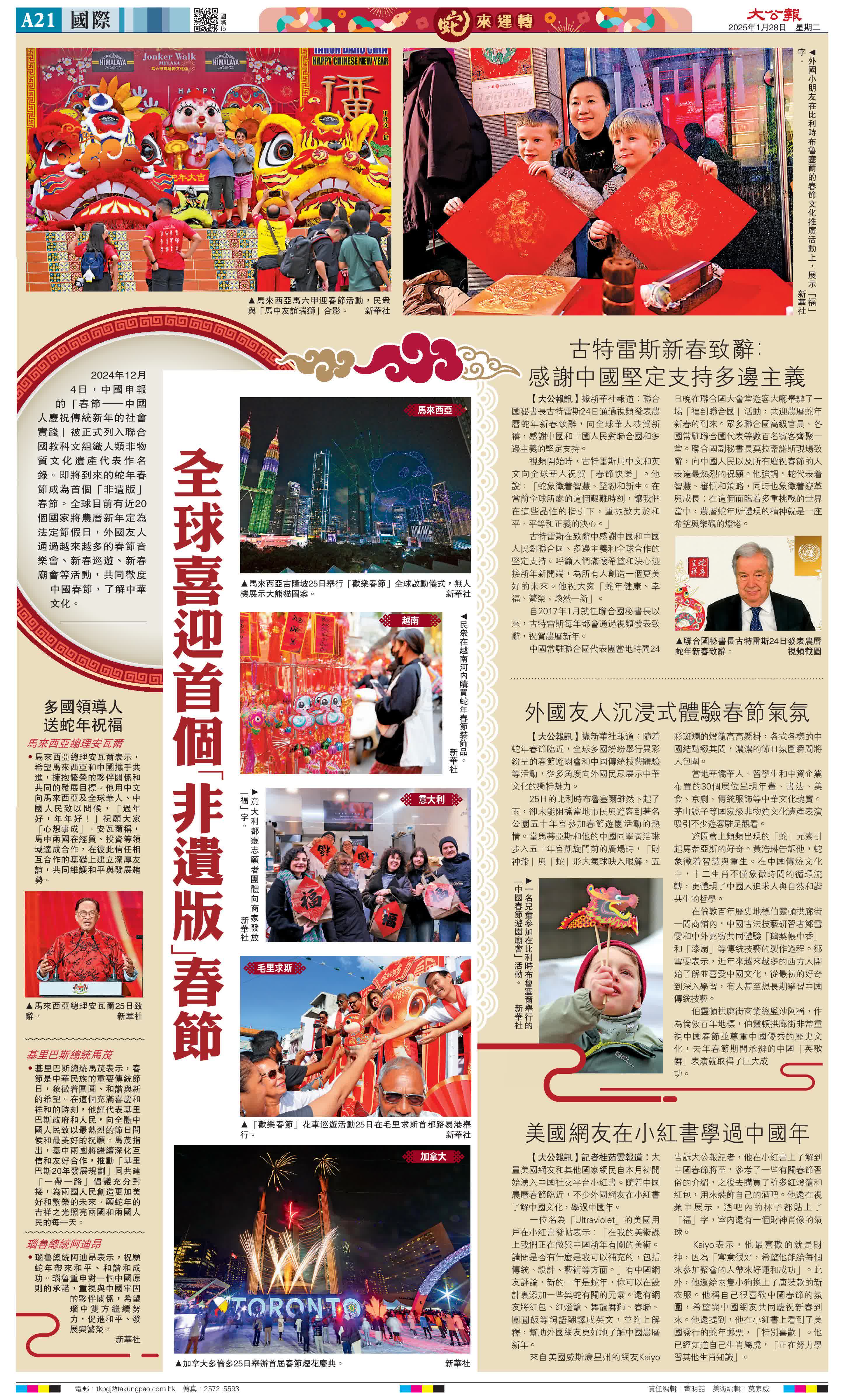 大公報綜合報道,2024年12月4日,中國申報的「春節─中國人慶祝傳統新年的社會實踐」被正式列入聯合國教科文組織人類非物質文化遺產代表作名錄。即將到來的蛇年春節成為首個「非遺版」春節。全球目前有近20個國家將農曆新年定為法定節假日,外國友人通過越來越多的春節音樂會、新春巡遊、新春廟會等活動,共同歡度中國春節,了解中華文化。