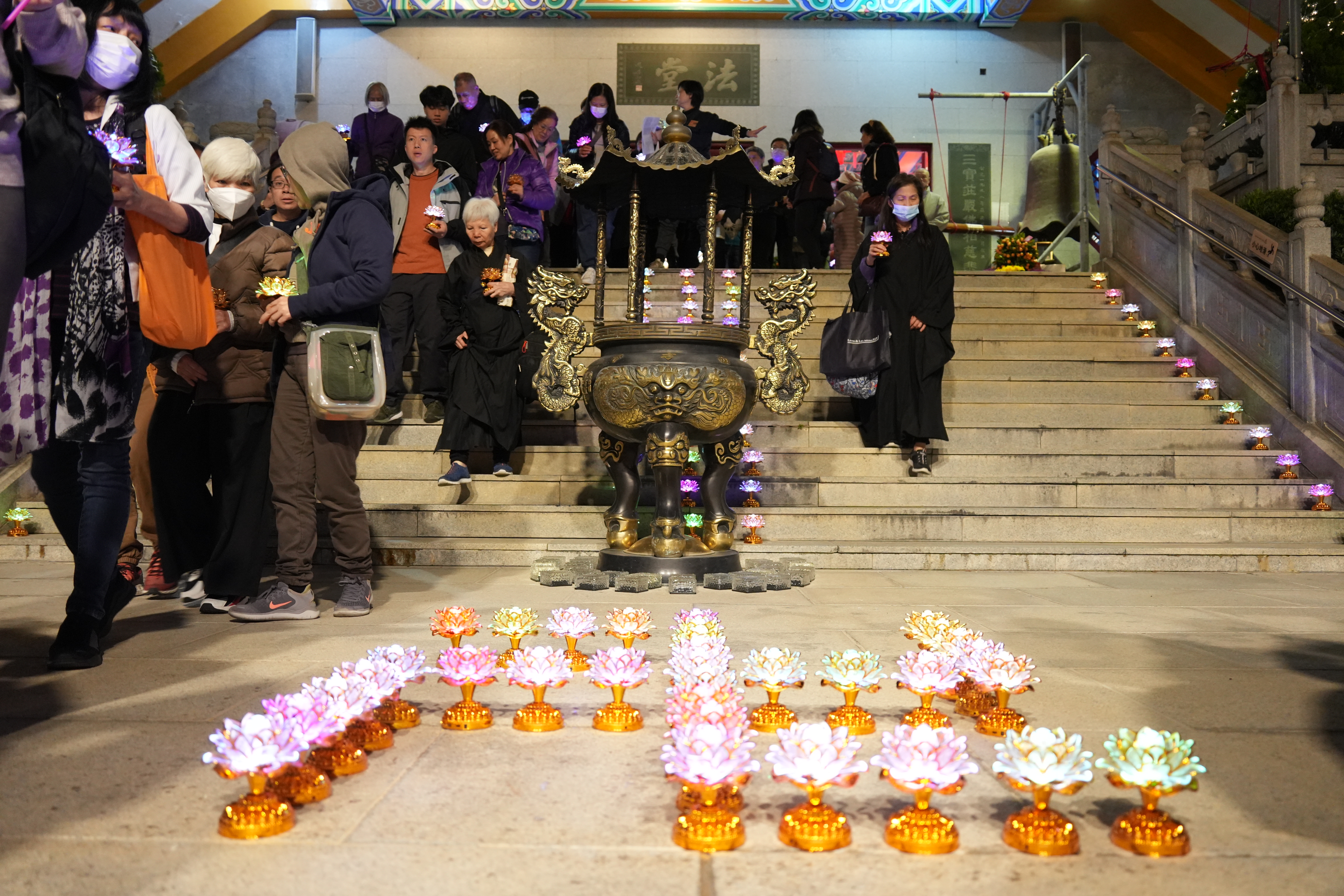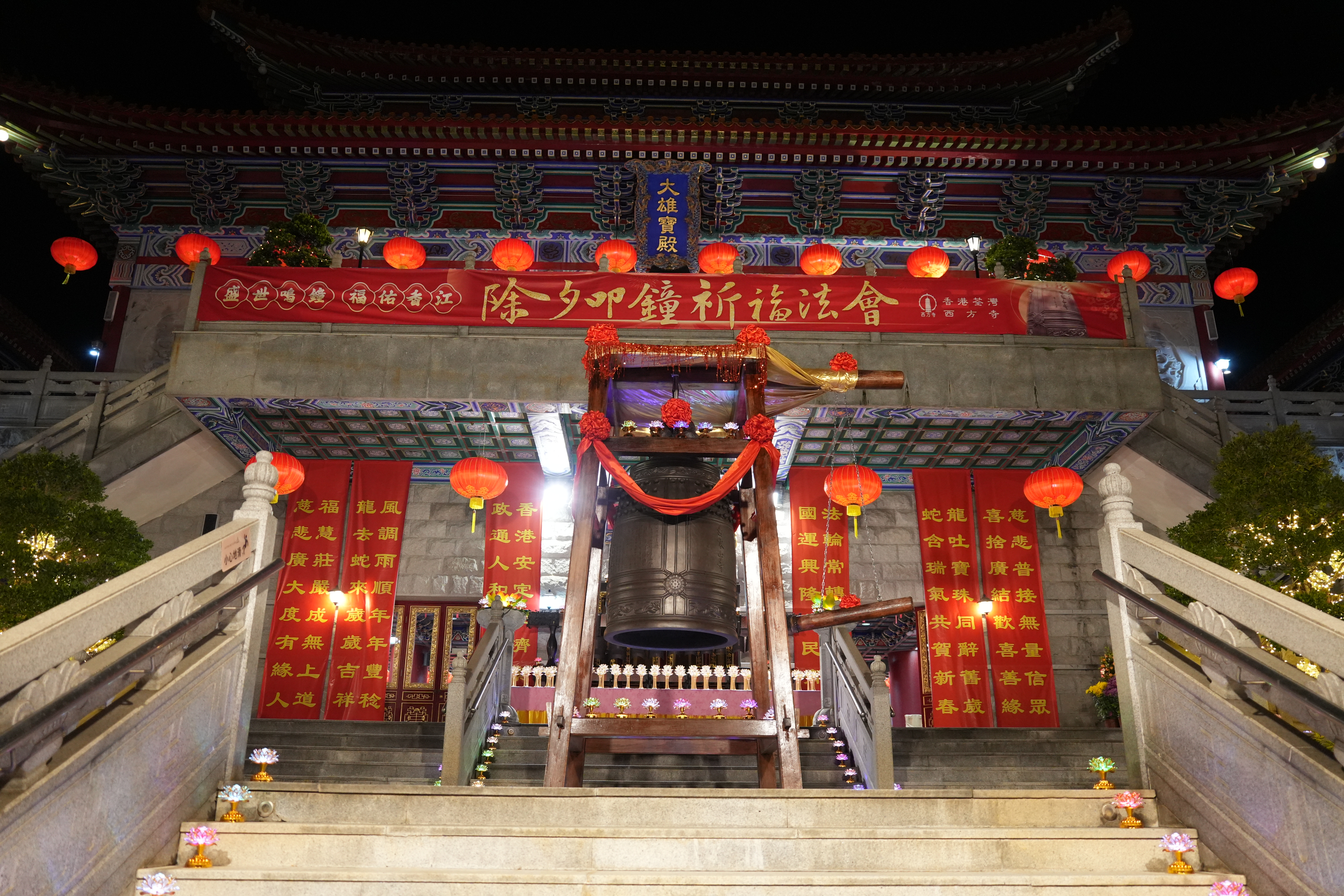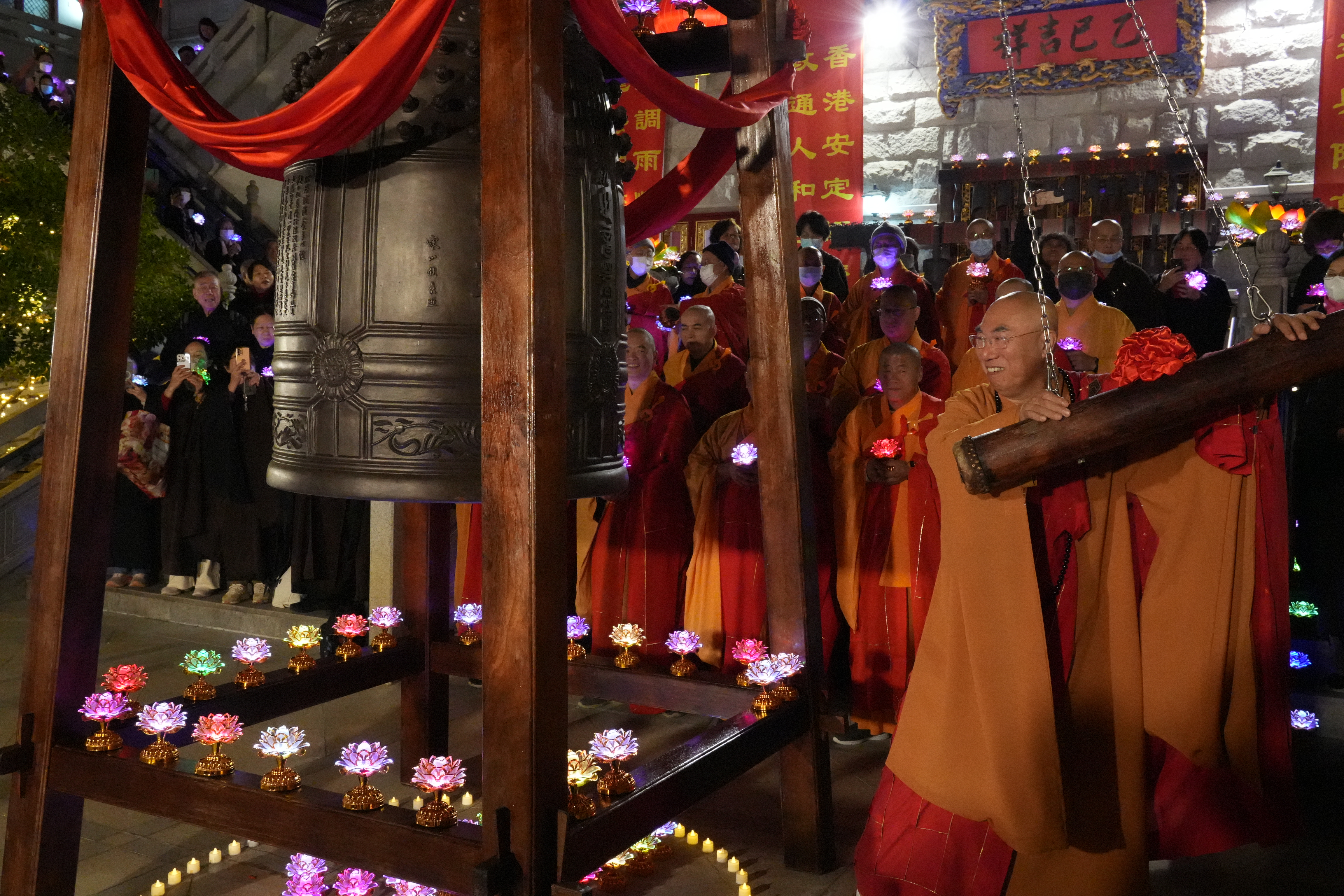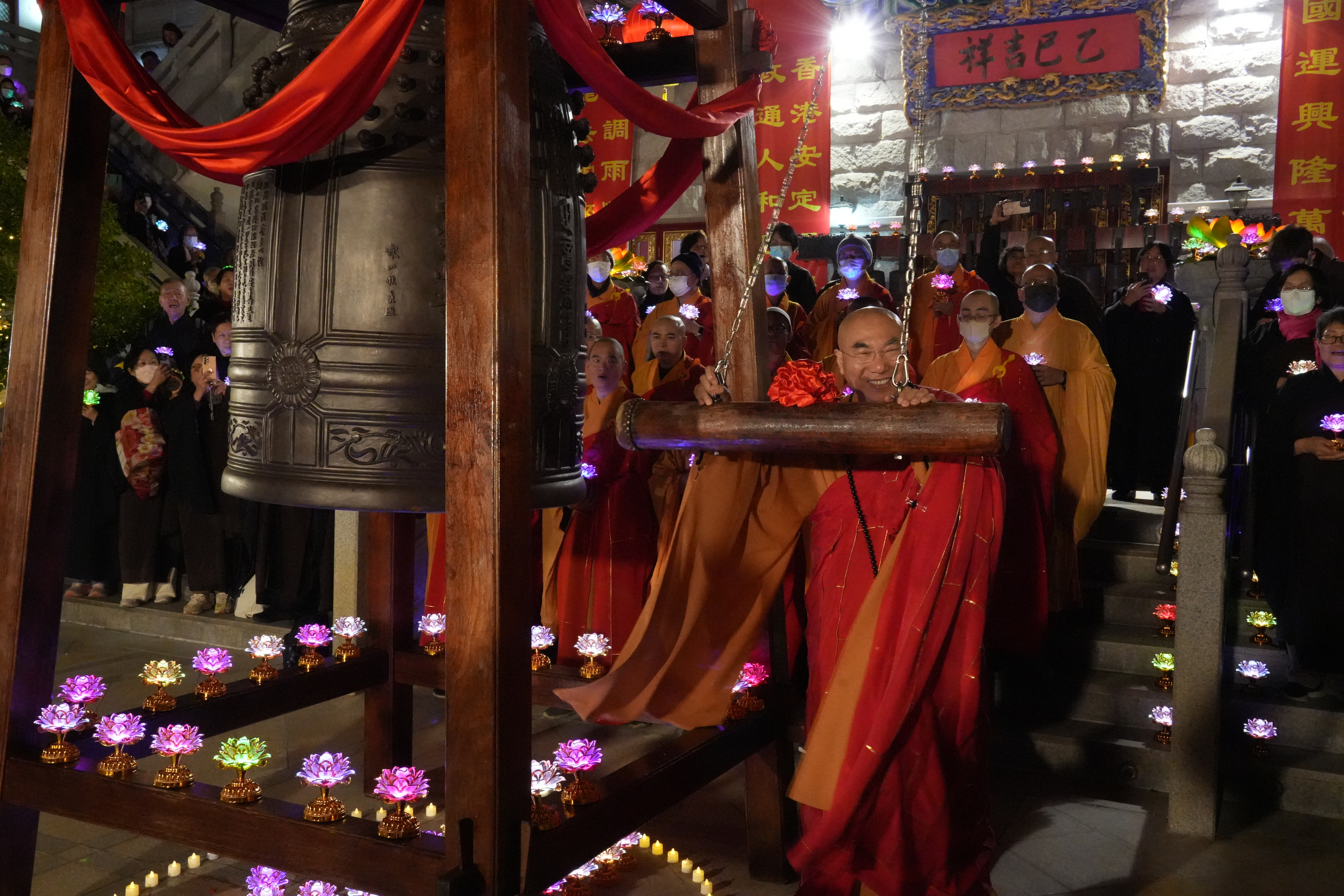 (大公文匯全媒體記者 王俊傑)叩鐘迎新是中國自古以來的文化傳統,荃灣西方寺去年接受蘇州寒山寺贈送的和合鐘後,今年第一次舉辦除夕叩鐘祈福法會,吸引了三百多位善信報名參加。叩鐘法會包括普佛、傳燈、上頭炷香、和叩鐘四個部分,方丈寬運大和尚及諸位法師帶領大眾一同祈福,並且藉由寒山鐘聲,將和平、喜樂帶給香江,祝福新年。