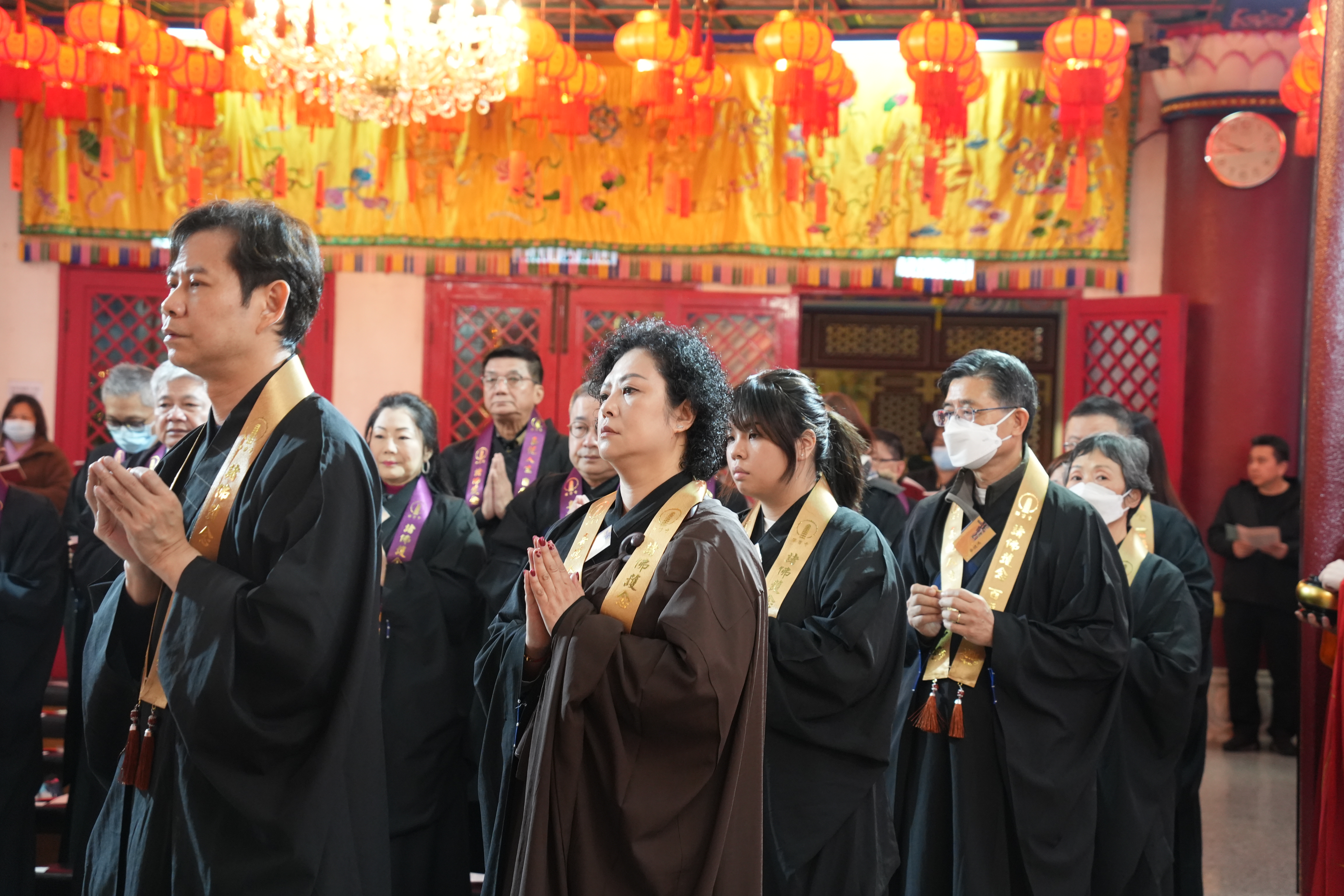 隨後,與會善信居士分組一一叩響和合鐘,紅燈籠掩映下的老圍西方寺洋溢著溫暖和睦的新年氣氛,花果飄香,寺院齋堂還贈送素食盆菜與善信居士們,表達祝福和感恩,叩鐘法會在一片祥和喜樂中圓滿結束。