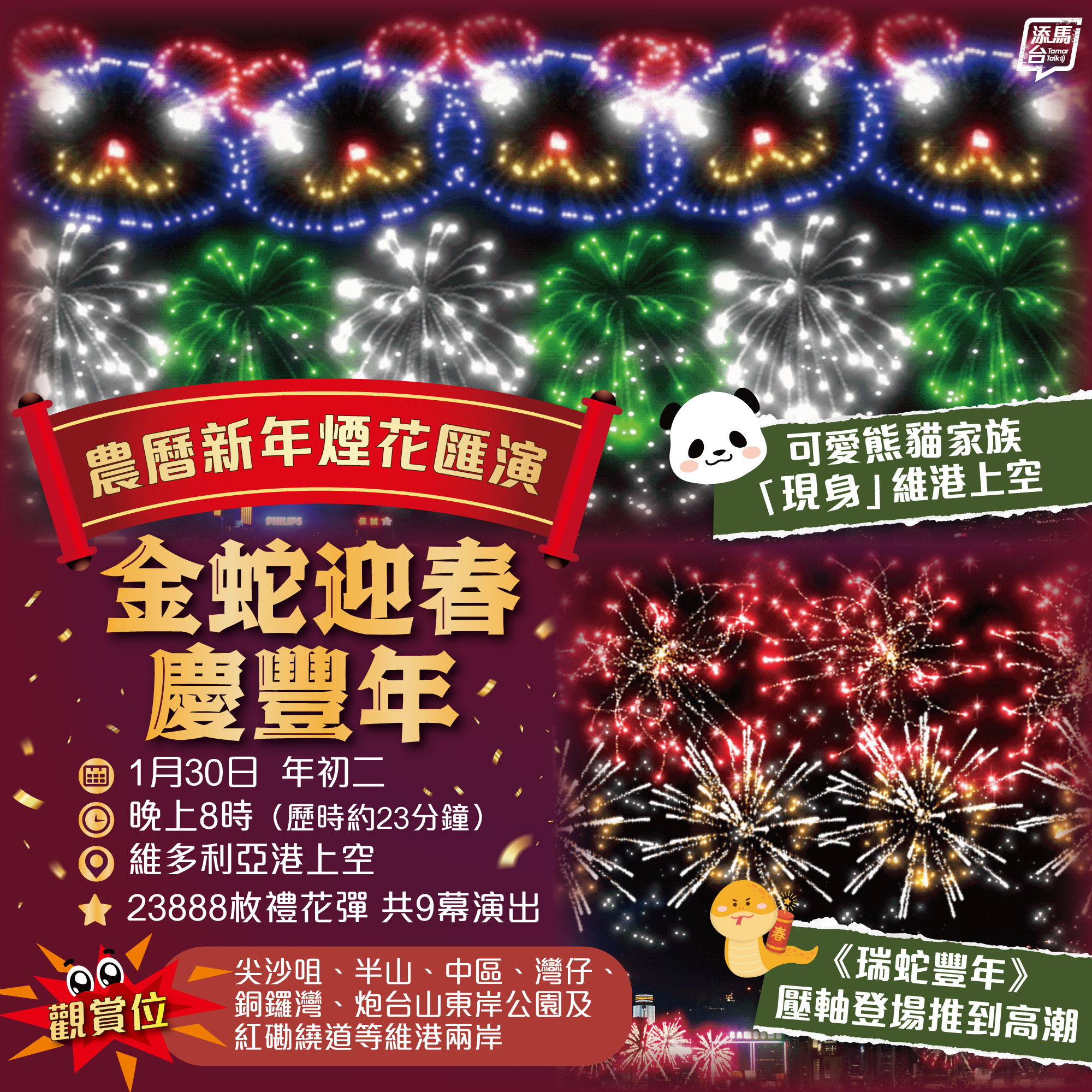 今年煙花匯演的主題為「金蛇迎春慶豐年」,分為九幕,各具特色。煙花匯演歷時約23分鐘,由三艘躉船發放23888枚禮花彈。第一幕《一元復始》和第二幕《花開富貴》將分別閃現幸運紅「8」字和金元寶圖案,祝願香港市民花開富貴和財源滾滾。