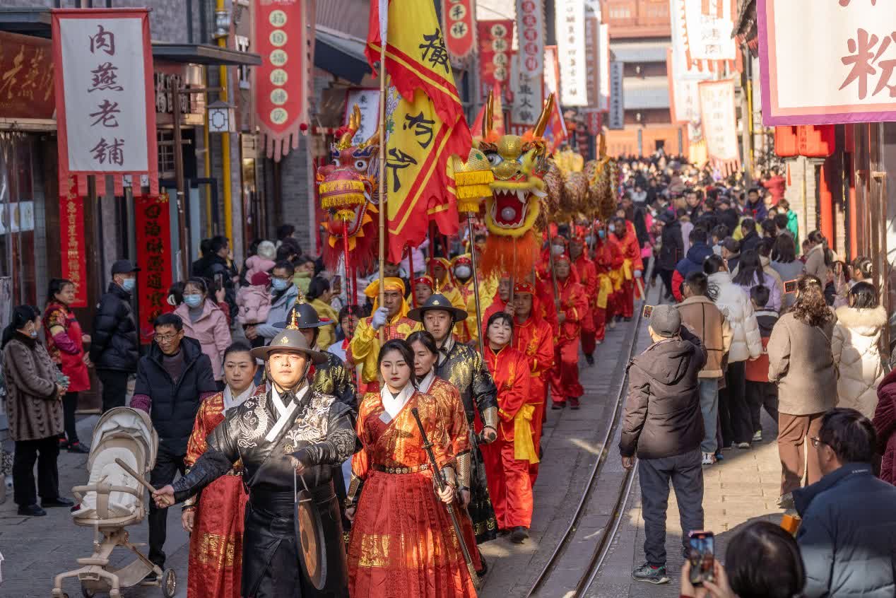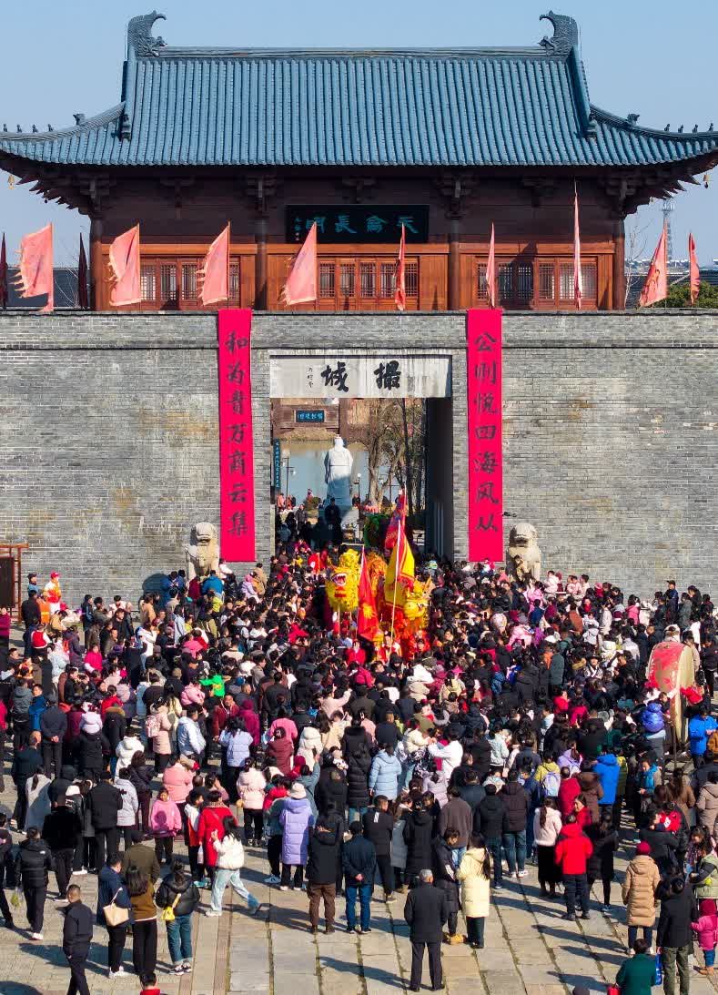 舞祥龍、致祝詞、「鬥」文采……29日,農曆大年初一,安徽省合肥市肥東縣撮街第三屆迎新春民俗文化季隆重啟幕,現場鑼鼓喧天,張燈結綵,處處洋溢着濃濃的年味。撮城城樓下,9位青年才俊「鬥」接龍詞,「唇槍舌劍」賀新年,妙語連珠送福氣,吸引眾多遊客和市民觀「戰」。