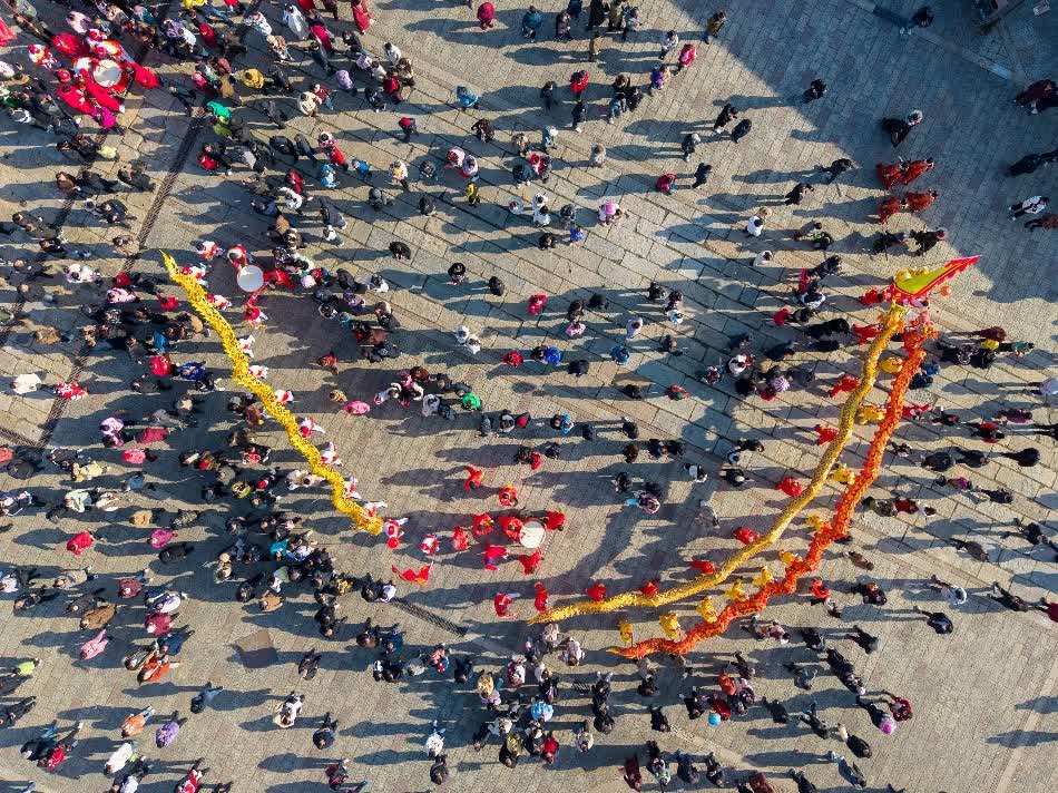 「一擊鼓音鏜鏜響城四方,二擊鳳翥虎將共聚其堂,三擊聖行肅穆千古流芳……」隨着撮街廣場盛大的擊鼓迎春儀式舉行,接龍祝詞活動拉開序幕,60名身着盛裝的舞龍隊員,高舉着3條長達20米的祥龍,在廣場上依次列隊,龍頭高昂,神采奕奕,蓄勢待發。