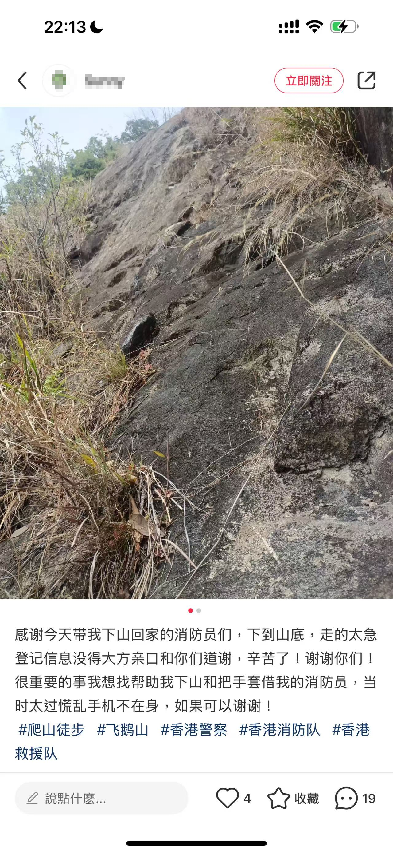大公文匯全媒體報道,年初三「赤口」有內地遊客行飛鵝山,期間疑迷路被困峭壁報警求助,最終由消防帶返山下。有疑似事主今日(31日)小紅書發文向救援人員表示感謝,並提到當時有消防員將手套借給她,希望親身表達謝意。