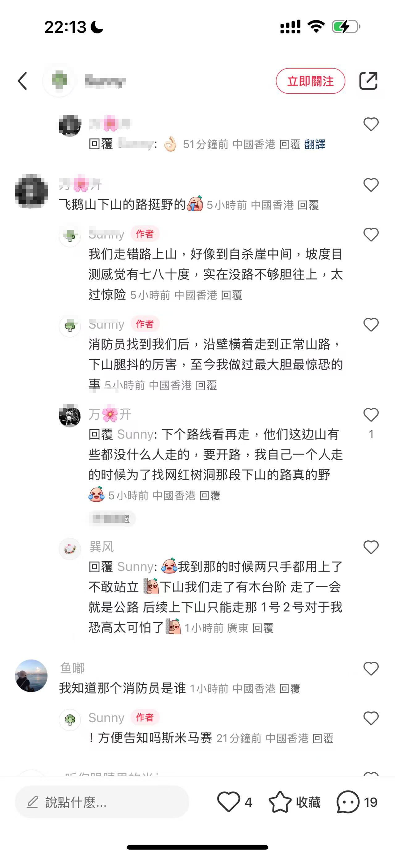 小紅書有網民發文指,今日到飛鵝山徒步,期間「走錯路上山,好像到自殺崖中間,坡度目測感覺有七八十度」,又指「實在沒路不夠膽往上,太過驚險」,無奈被困山上。事主報警後被消防尋獲,「消防找到我們後,沿壁橫着走到正常山路」,下山時事主「腿抖得厲害」,形容是「我做過最大膽最驚恐的事」。她提到,下山時有消防員將手套借給她,令她大為感動。據事主回憶,當時下到山底後走得太急來不及親口同救援人員道謝,「辛苦了!謝謝你們!」。