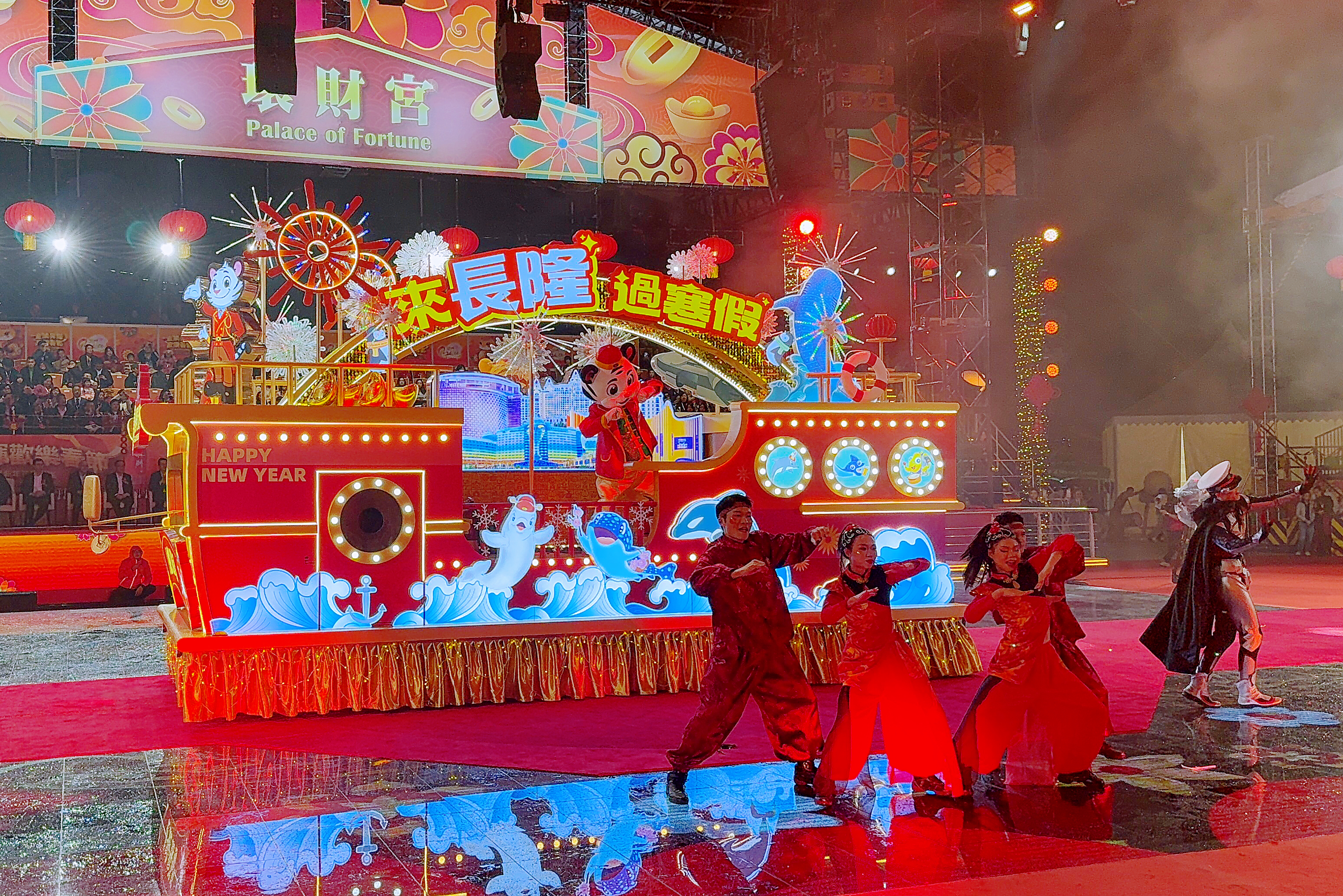 隨着夜幕降臨,花車巡遊率先啟動。17輛精美的花車、超30支表演隊伍駛入澳門會場,並駛入澳門主街道,吸引沿途觀眾的目光。其中,橫琴長隆的花車以「海洋奇幻之旅」為主題,花車主體由鯨鯊和企鵝兩大海洋明星組成;花車隊伍還有靈動的「水精靈」姐姐,引得現場觀眾歡呼。