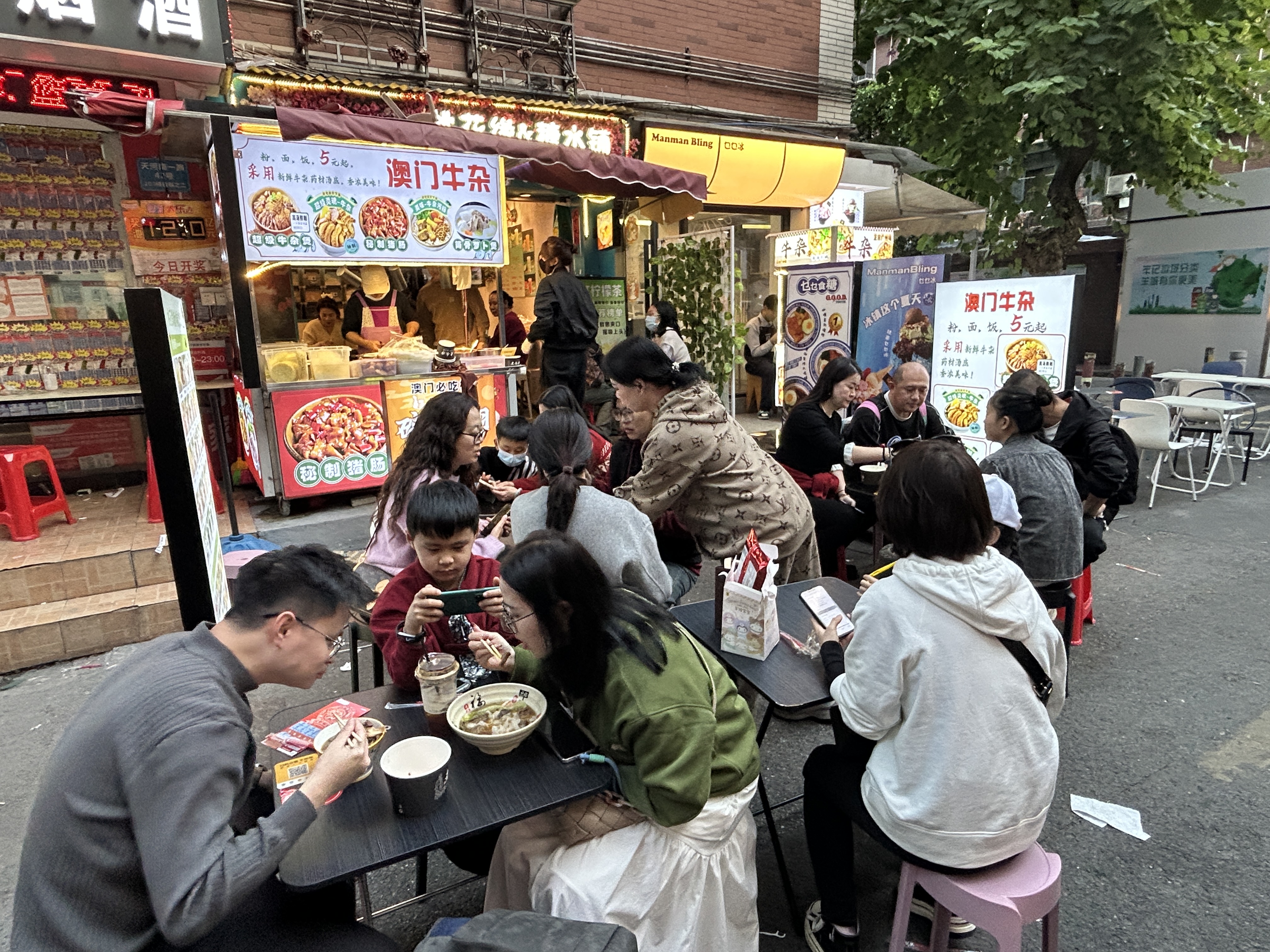 (大公文匯網 記者 敖敏輝 廣州報道)春節期間,有港青魚蛋仔受到歡迎,又澳門青年創製的牛雜被追捧。正月以來,廣州天河區六運小區內的桃花緣糖水鋪每一張桌椅都擠得滿滿當當。「90後」澳門青年林文騰,是這家主營牛雜的小店的主要創始人。這是桃花緣2023年在此落地以來,迎來第二個不打烊的春節假期。只有17平方米的小店,每日線下訂單量接近500份。